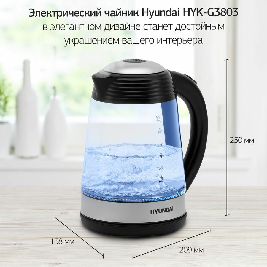 Купить Чайник электрический Hyundai HYK-G3803 1.7л. 2200Вт черный/серебристый (корпус: стекло)