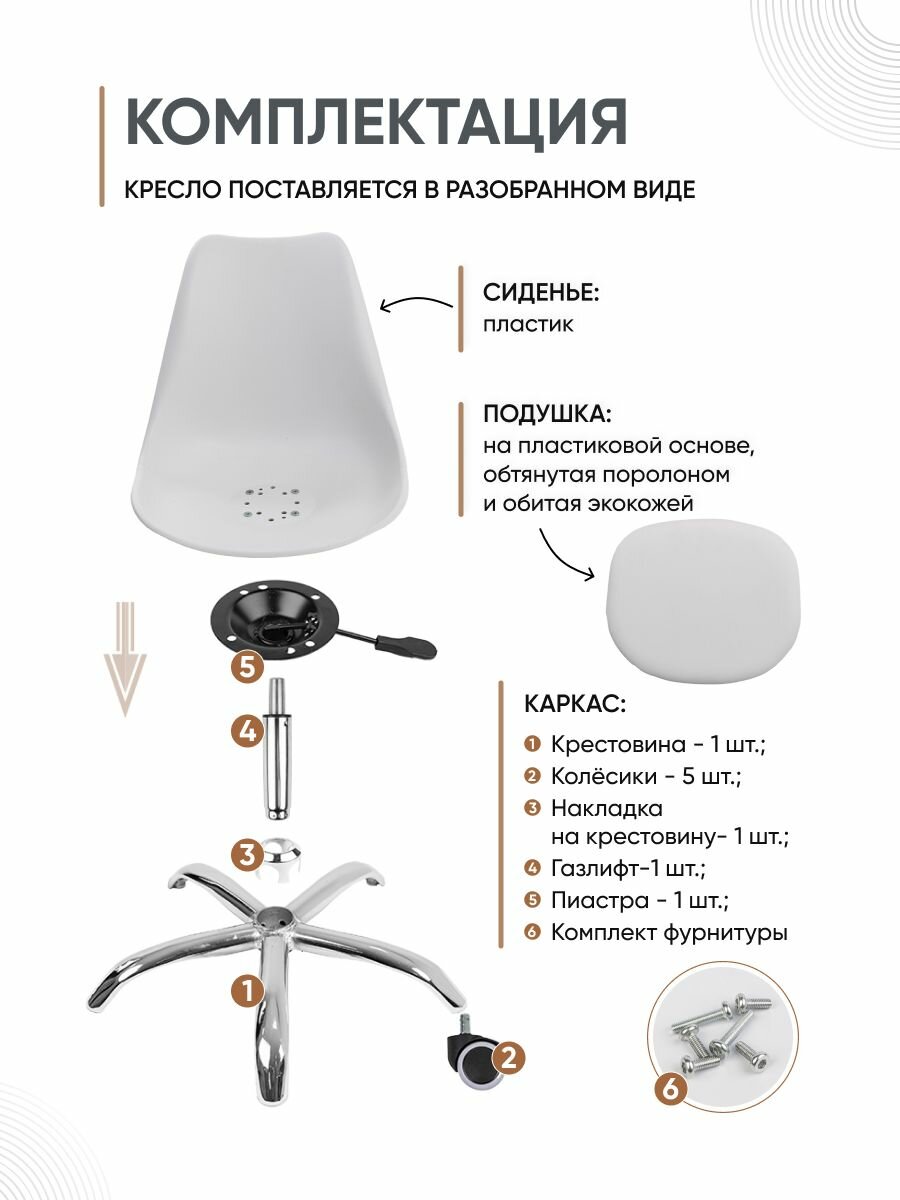 | Комплектация | Сиденье, колёсики, накладка на крестовину, газлифт, пиастра, комплект фурнитуры, инструкция |