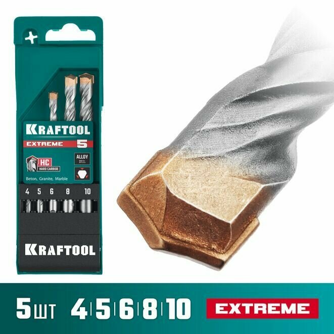 KRAFTOOL EXTREME 5 шт: 4-5-6-8-10 мм набор сверл по бетону, 3-х гранный хвостовик интересное: