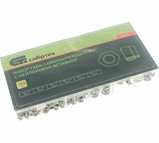 СИБРТЕХ Набор гаек М4, М5, М6, М8, М10, М12, самоконтрящиеся, с Нейлоновой вставкой, 146 предметов Сибртех, ( 47613 )