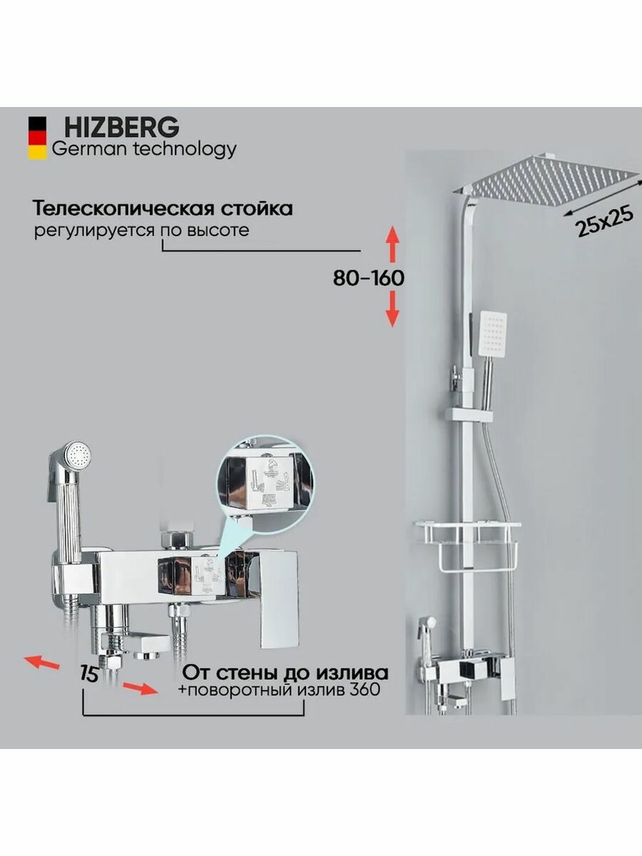 | Особенности | держатель душевой лейки / поворотный излив / регулируемый верхний душ |