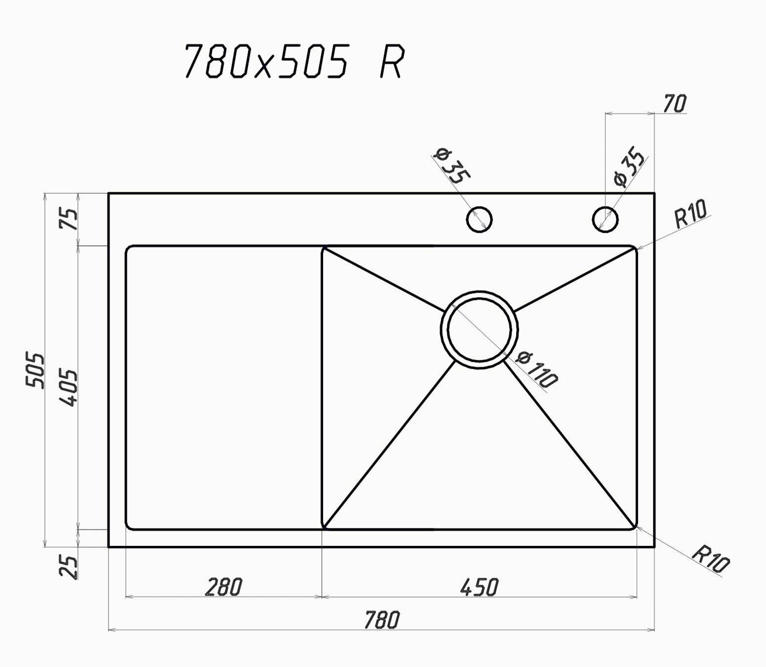 Кухонная мойка VANS 780*505 (780*505) Satin правая нерж. сталь