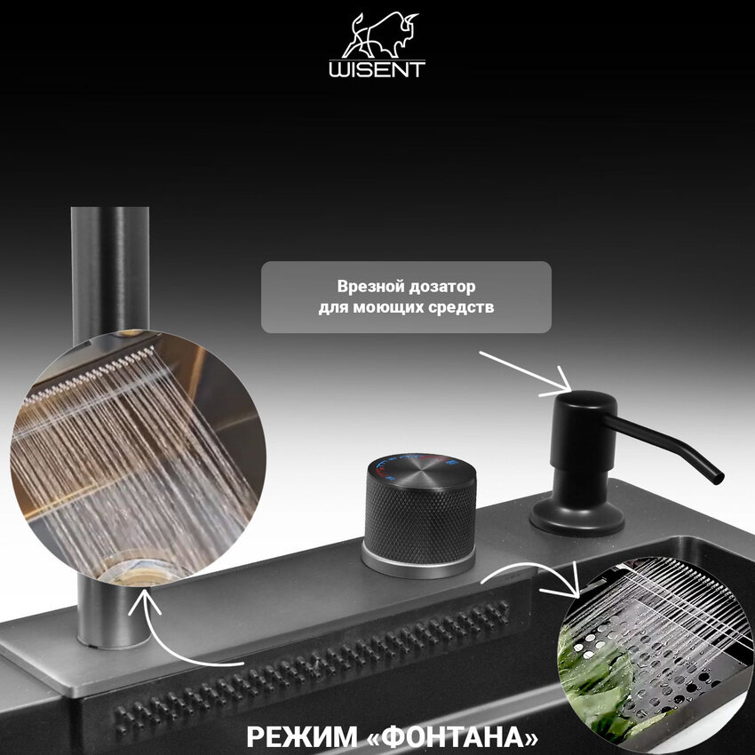 СохранитьМногофункциональная мойка для кухни с водопадом и душем 75*45 с PVD покрытием Wisent WG37545B-S интересное: