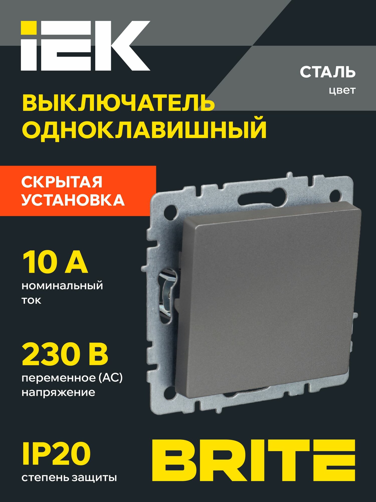 BRITE Выключ. 1-кл. 10А ВС10-1-0-БрС сталь IEK