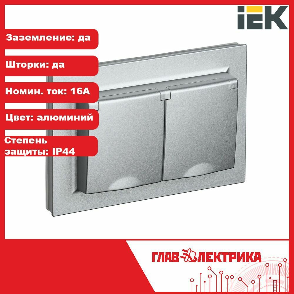 Розетка двойная с заземлением с защитными шторками и крышкой 16А в сборе IP44 алюминий BRITE, IEK BR-R26-16-44-K47-F (1 шт.)