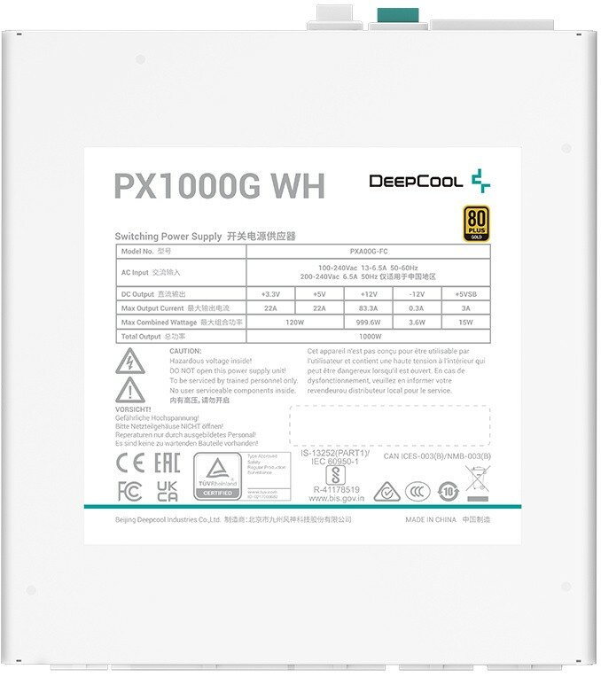 Блок питания 1000W DeepCool PX1000G Gen.5 (R-PXA00G-FC0W-EU), белый, 80 Plus Gold, ATX
