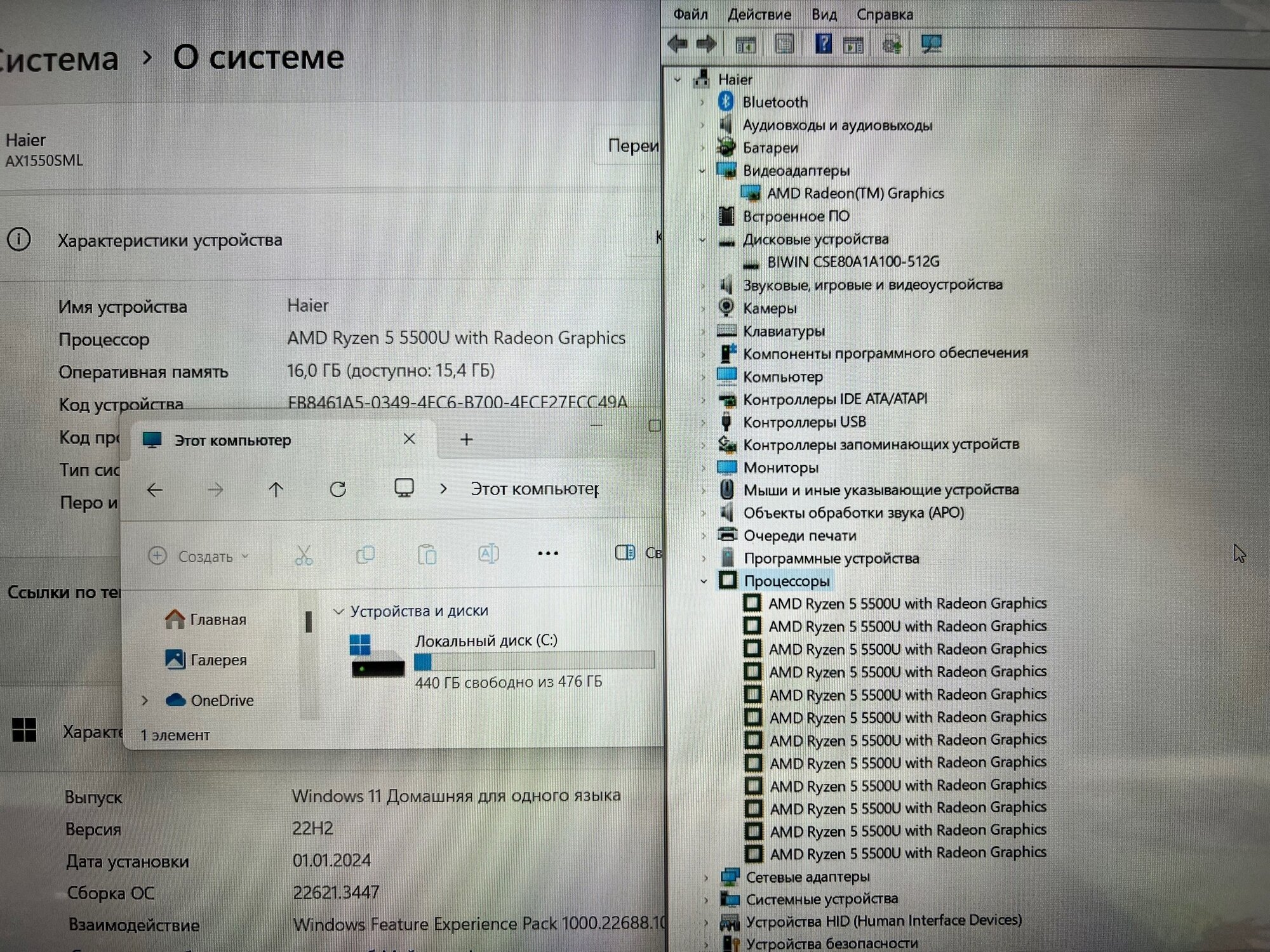 Ноутбук Haier AX1550SML/15.6"/AMD Ryzen 5 5500U/16/512/Win/Grey интересное: