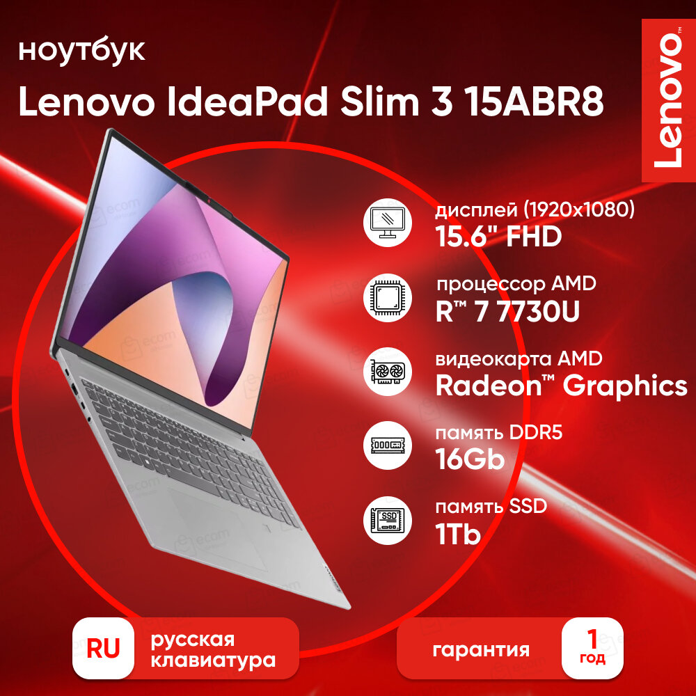 Ноутбук Lenovo IdeaPad Slim 3 15ABR8 15.6", 2023, TN, AMD Ryzen 7 7730U 2ГГц, 8-ядерный, 16ГБ DDR4, 1ТБ SSD, AMD Radeon, без операционной системы, серый [82xm000ark]