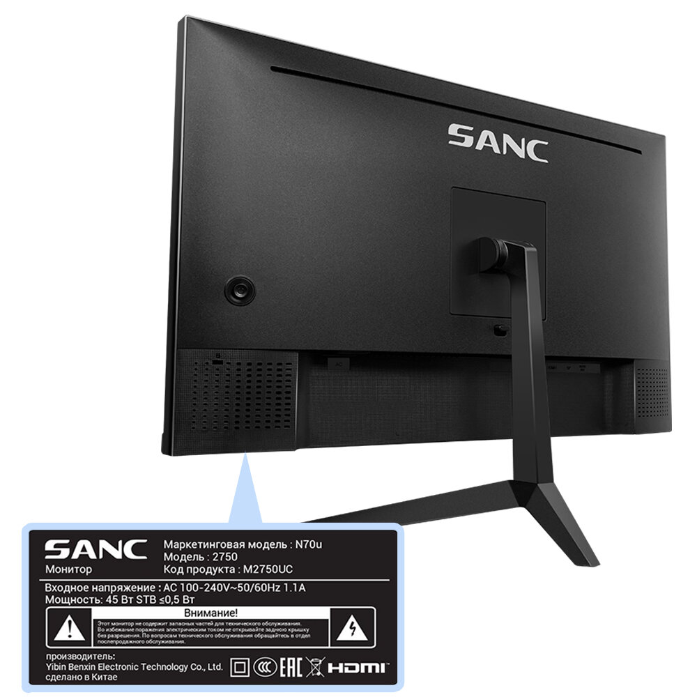 Монитор 27" SANC M2750UC (N70u), UHD, IPS, 3xHDMI, DP, Черный 6974772490366