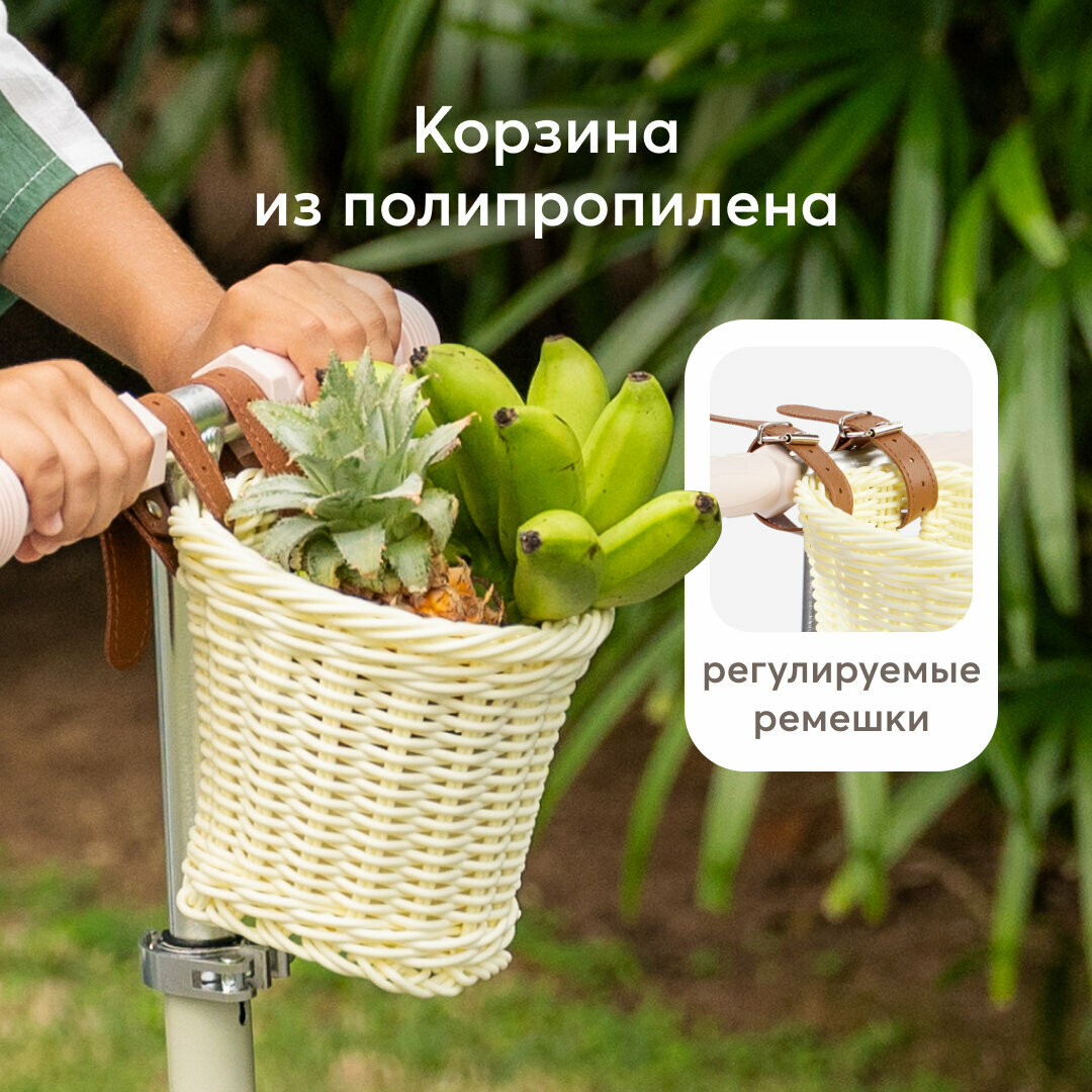50035, Самокат Happy Baby TORNADO V2, со светящимися колесами, высота руля регулируется, со стикерами и корзиной, бежевый