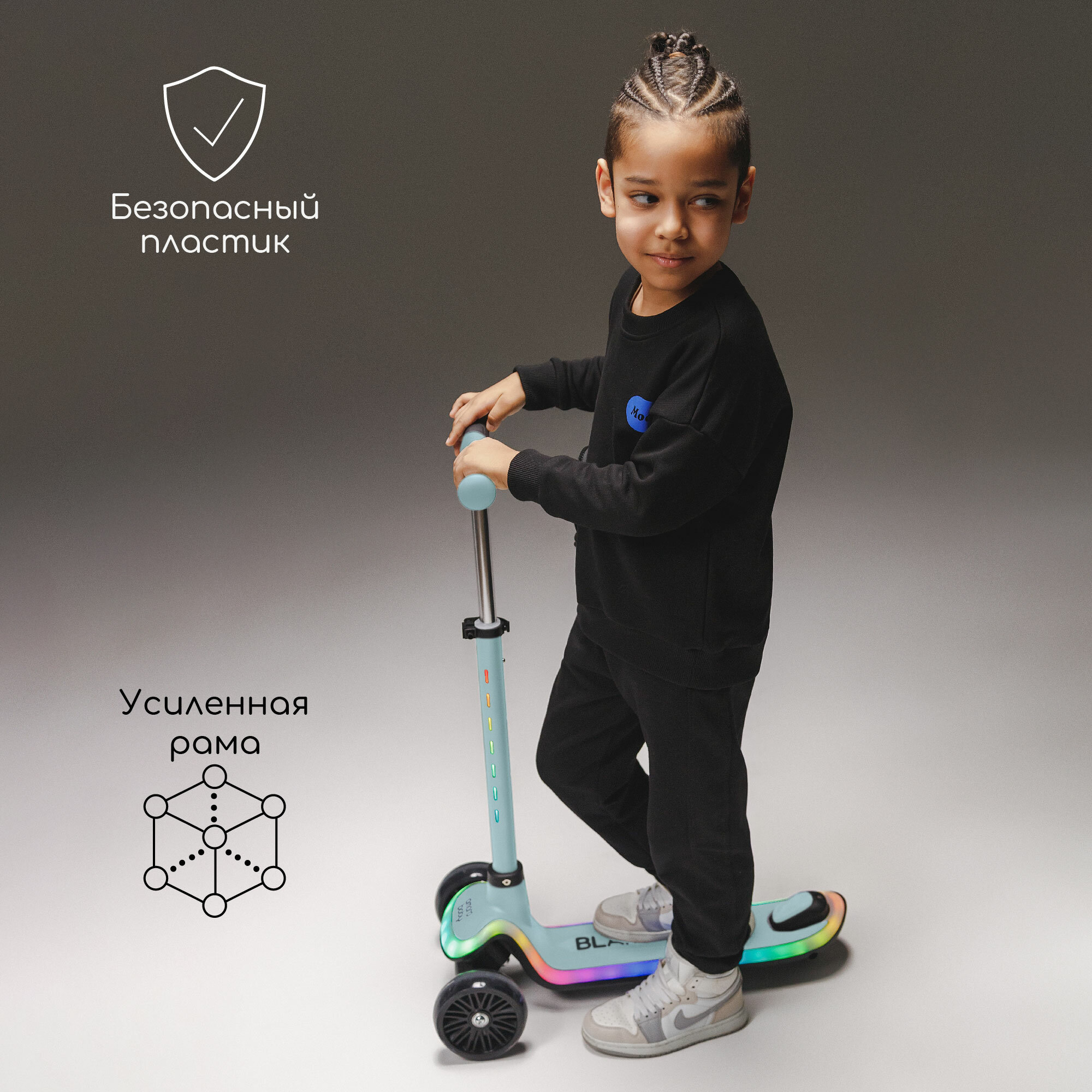 | Конструктивные особенности | амортизатор / литые колеса / регулировка высоты руля / светящиеся колеса |