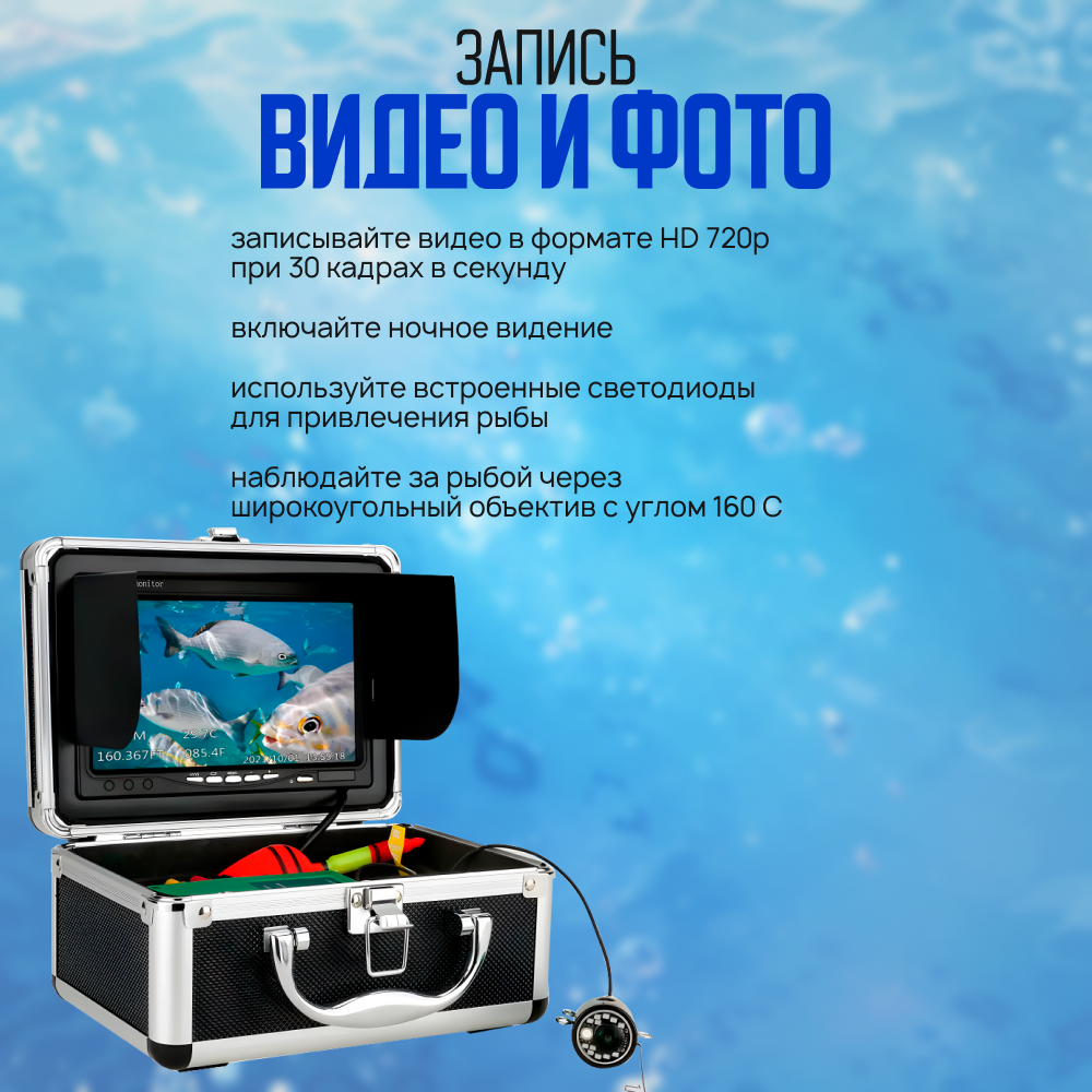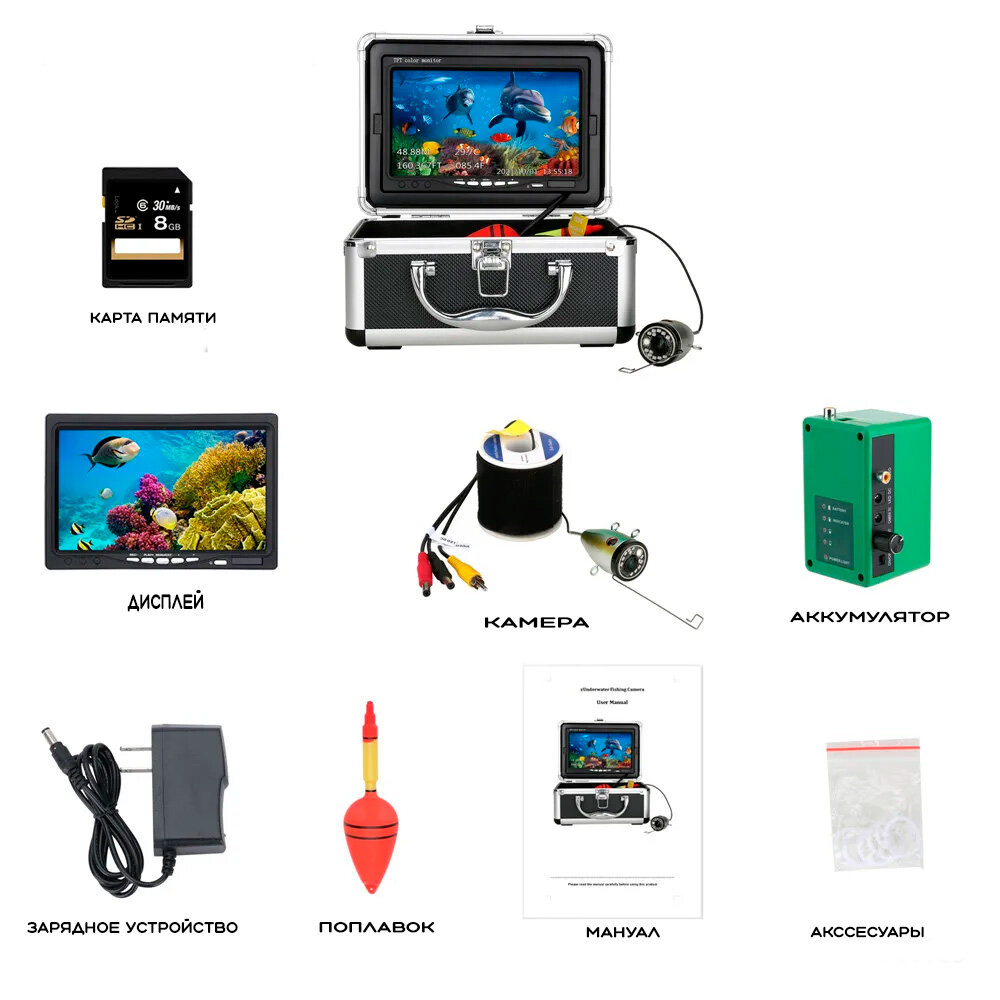 | Дополнительная информация | длина кабеля трансдьюсера/камеры: 15 м; максимальное время работы без подзарядки: 8 ч; подробная комплектация: Монитор 1 шт / Камера и кабель 1 шт / SD-карта 8 Гб 1 шт / Аккумулятор 1 шт / Зарядное устройство 1 шт / Поплавок 1 шт / Солнцезащитный козырек 1 шт / Аксессуары 1 шт / Крышка 1 шт / Бинт 1 шт / Руководство пользователя 1 шт |