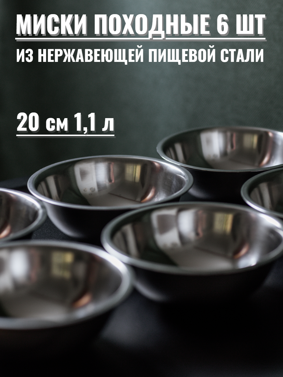 Миски походные 20 см, объём 1,1 л, набор 6 шт, нержавеющая сталь