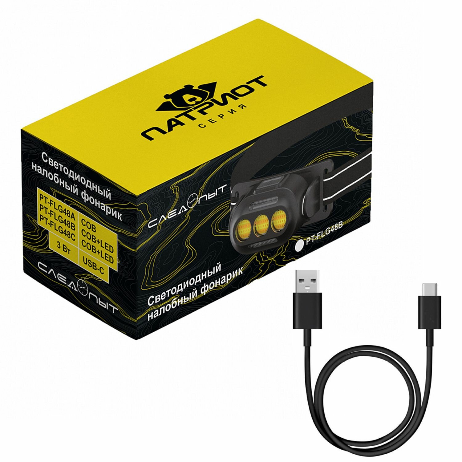 Фонарь светодиодный налобный Патриот PT-FLG48B 3LED 4 режима (встр.аккум., ЗУ-USB TYPE-C), Патриот