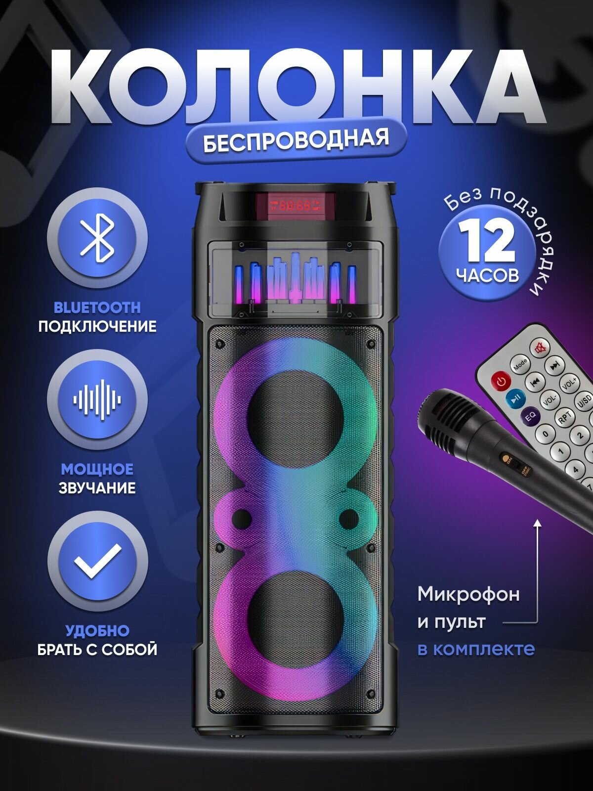 Купить Колонка беспроводная музыкальная портативная с микрофоном с регулируемой подсветкой (переносная, большой мощности, блютуз колонка) 5.0 Bluetooth с встроенным аккумулятором Черная