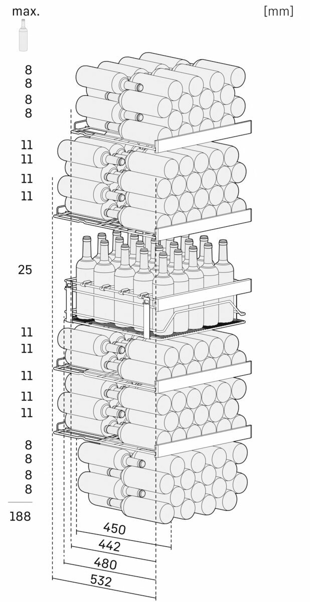 | Емкость винного шкафа, бут. | 188 |