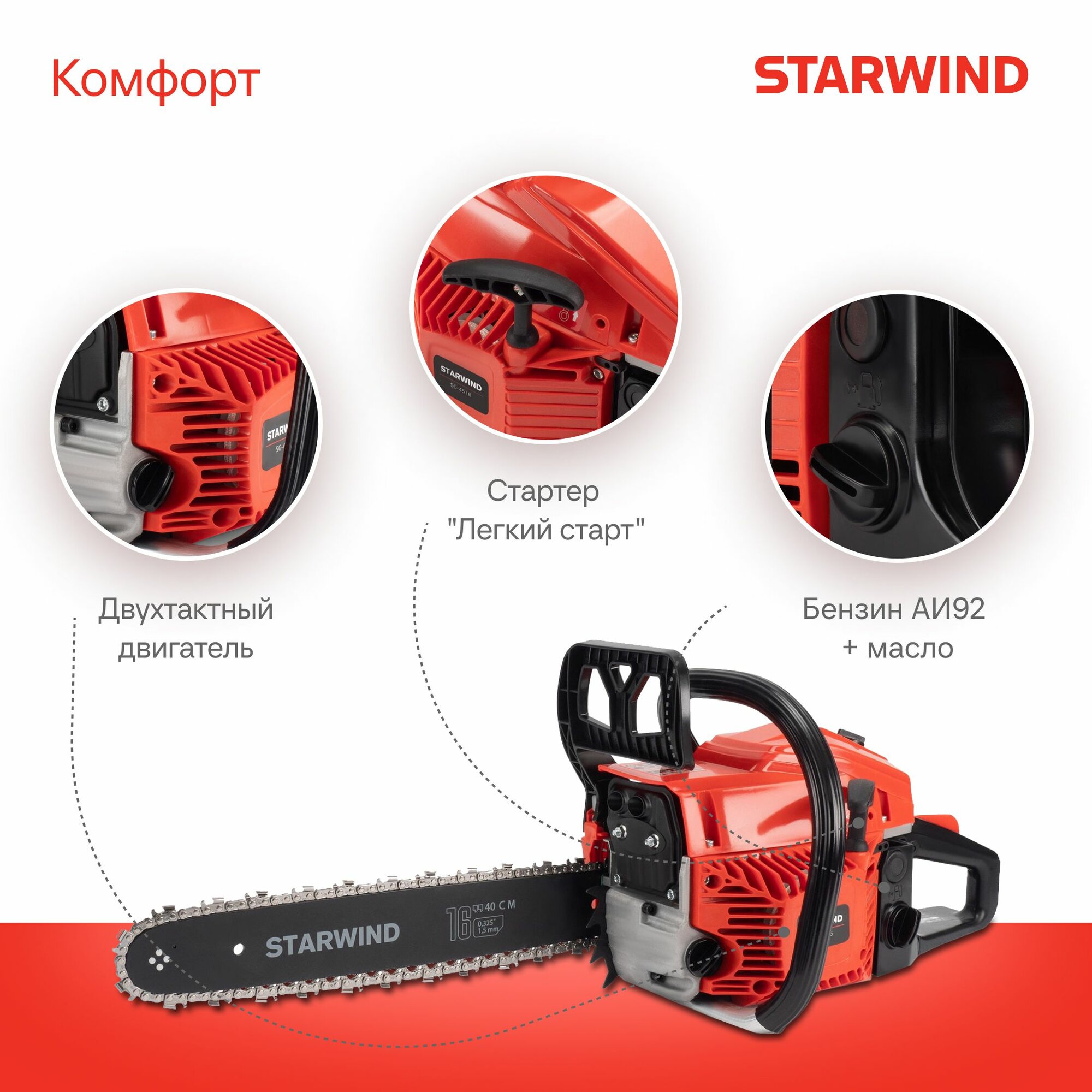 Бензопила цепная Starwind SG-4516 бензиновая 3 л.с. длина шины: 16" - 40 см. интересное: