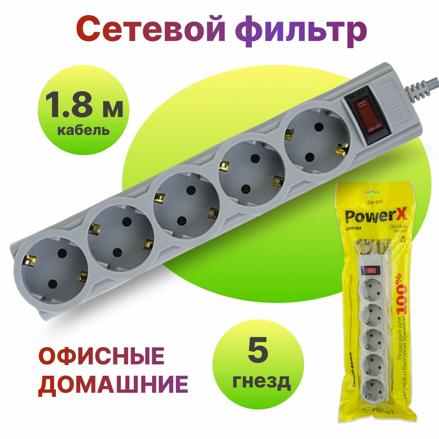 Сетевой фильтр Perfeo "POWERX", 1,8м, 5 розеток, серый.