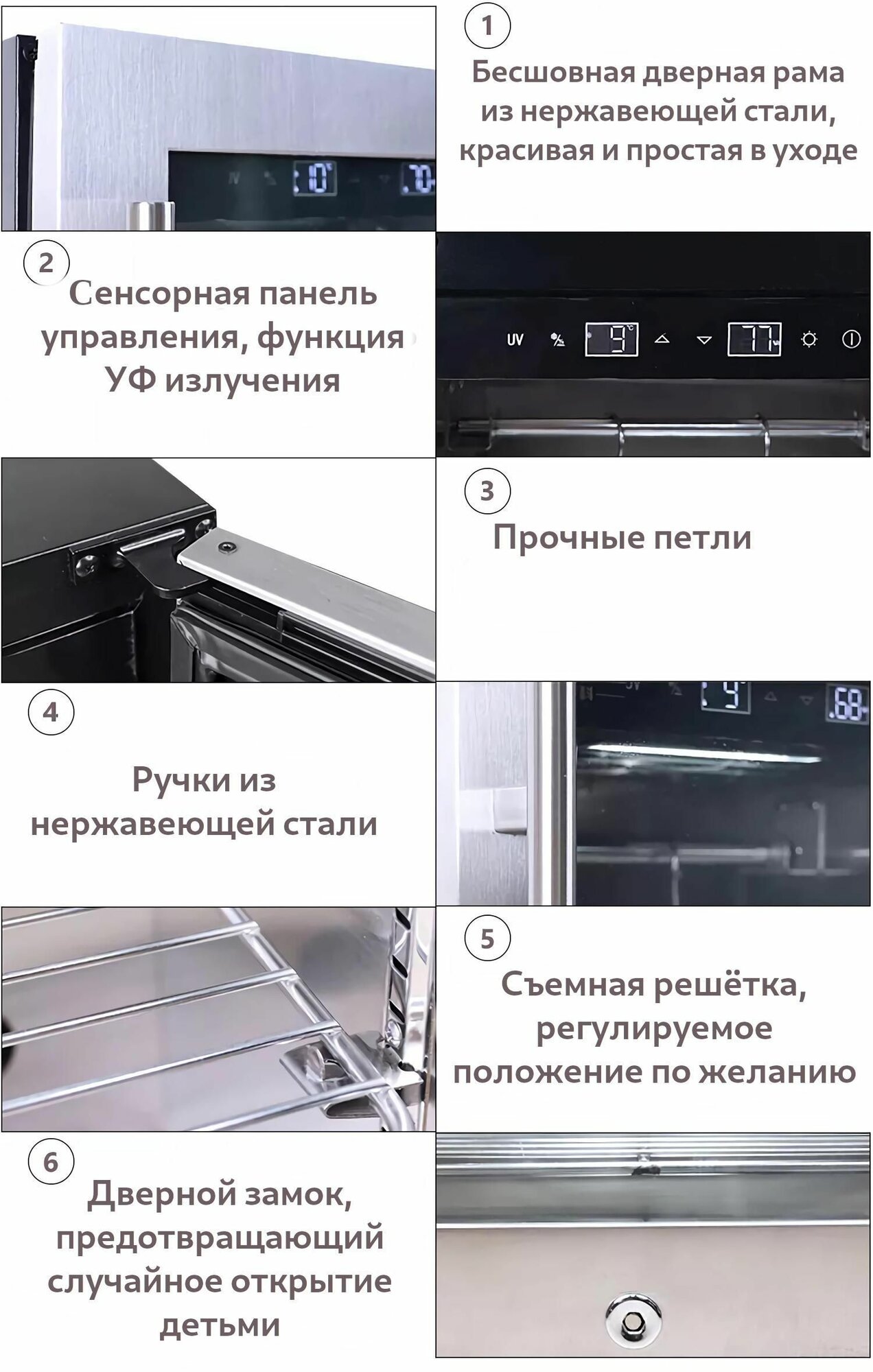 | Дополнительная информация | Touch Control. Трехслойное анти-УФ стекло. Бесшовные двери из нерж стали. УФ лампа. Фильтрация воздуха. |