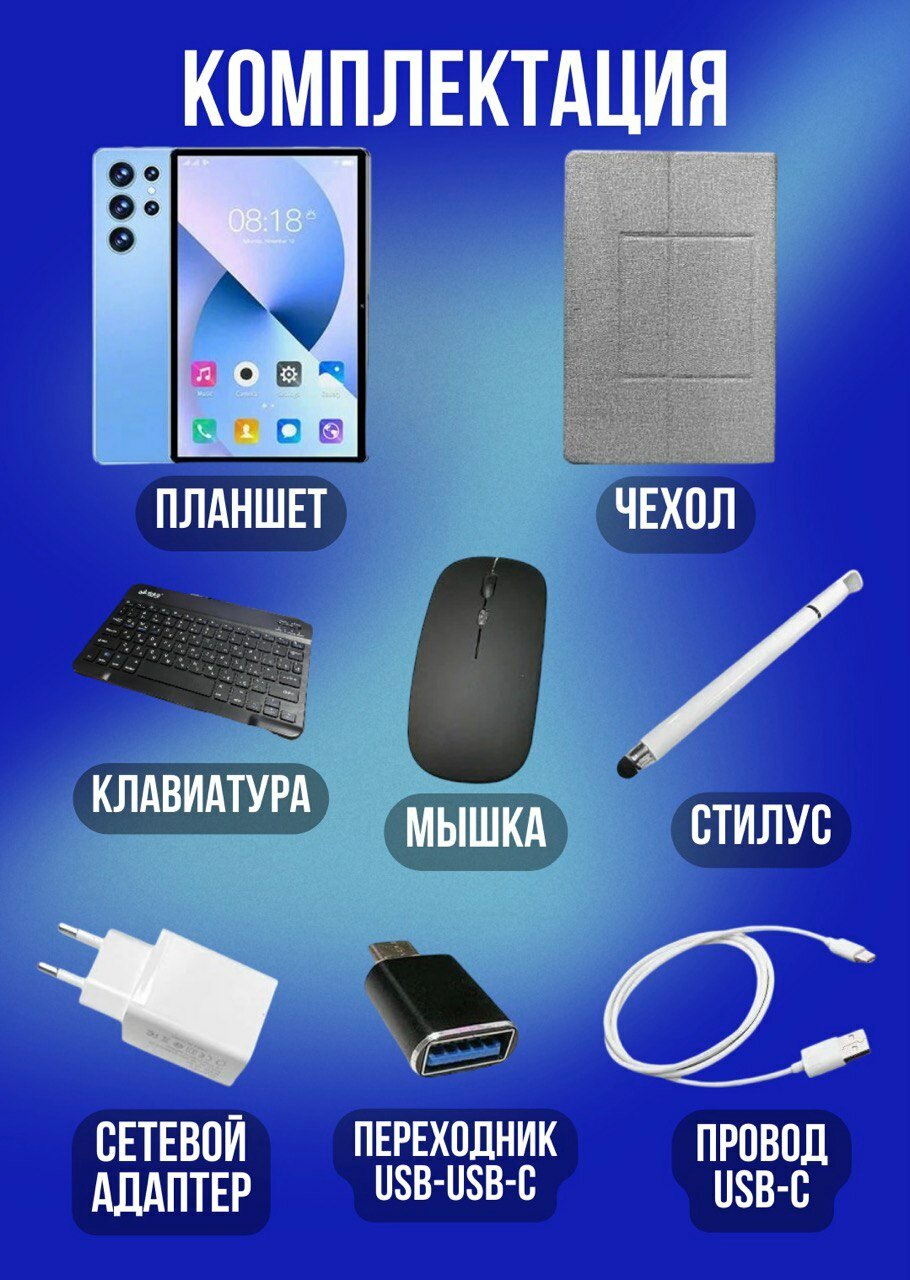 | Комплектация | Стилус; мышь; кабель зарядки; блок питания; защитное стекло; чехол; клавиатура; игла для сим. |