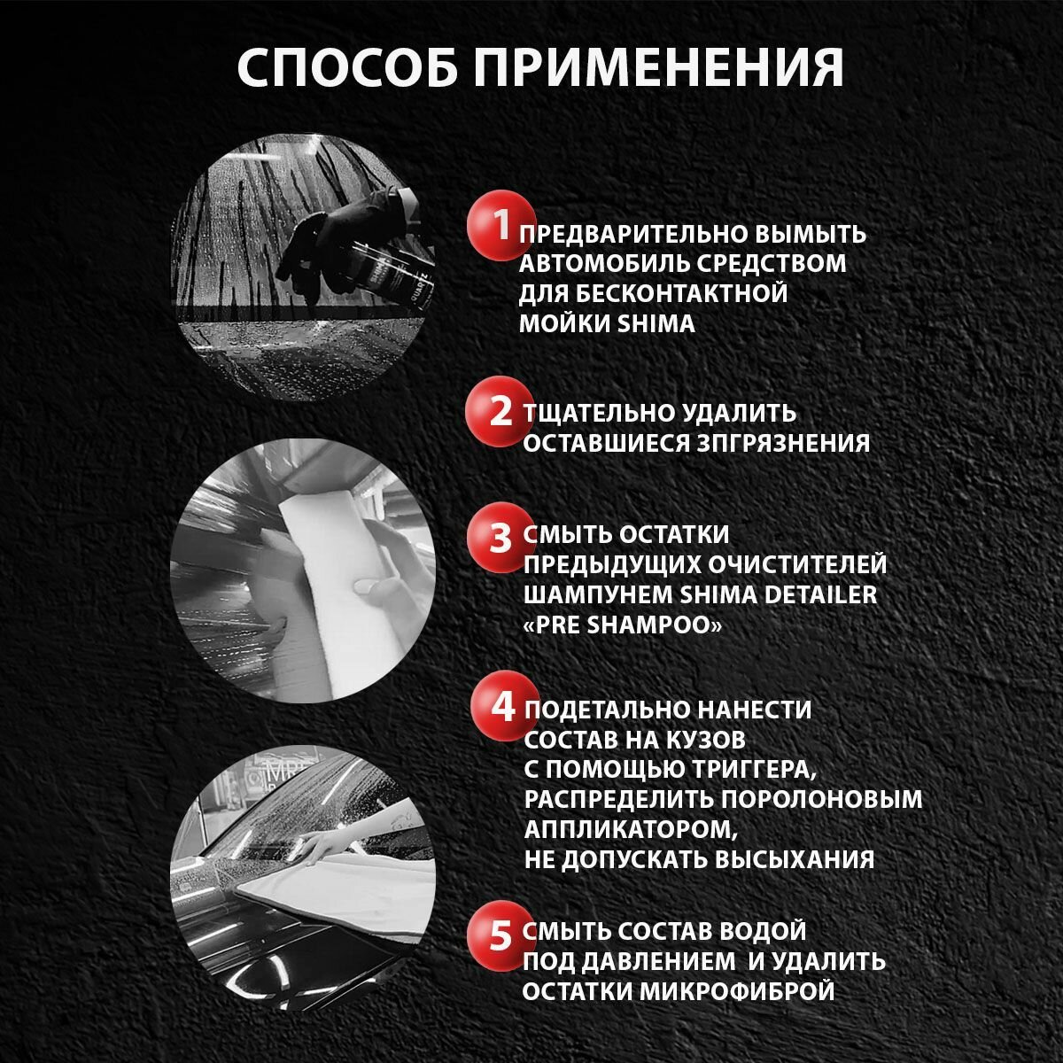 | Способ применения | 1. Предварительно вымойте автомобиль любым средством для бесконтактной мойки “SHIMA”. 2. Далее для более глубокой очистки кузова необходимо произвести тщательное удаление оставшихся загрязнений таких, как смола и битум, металлические вкрапления во избежание дальнейшего закрепления данных загрязнений кварцевым покрытием на ЛКП. * Для удаления смолы и битума рекомендуется использовать SHIMA DETAILER “GREEN CLEANER”. * Для удаления металлических вкраплений – SHIMA DETAILER “FERRUM GEL”. 3. Следующим этапом необходимо смыть остатки предыдущих очистителей шампунем для ручной мойки SHIMA DETAILER “PRE-SHAMPOO”. 4. Затем подетально нанесите состав при помощи распылителя на мокрый кузов. ВАЖНО! Не допускайте высыхания состава на кузове! 5. Распределите состав по поверхности с помощью поролонового аппликатора. 6. Смойте состав с поверхности водой под давлением. 7. Протрите насухо искусственной замшей или микрофиброй. |