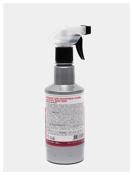 | Способ применения | Предназначен для обработки лакокрасочных поверхностей автомобилей и мотоциклов с целью очистки и придания им дополнительных защитных свойств, а также улучшения их внешнего вида. Перед применением встряхнуть. Не наносить на стекло, нагретую поверхность и под прямыми солнечными лучами! Обработку кузова производить последовательно, небольшими участками обработать каждую деталь кузова. Вымыть автомобиль и вытереть насухо. Распылить средство на участок, распределить по поверхности мягкой тканью. Располировать сухой салфеткой (микрофиброй) до появления блеска и легкого скольжения ткани по кузову. Рекомендуется использовать две тканевых салфетки: одну для распределения средства по поверхности, вторую – для располировки. На поверхность вблизи стекол наносить средство с помощью ткани. |