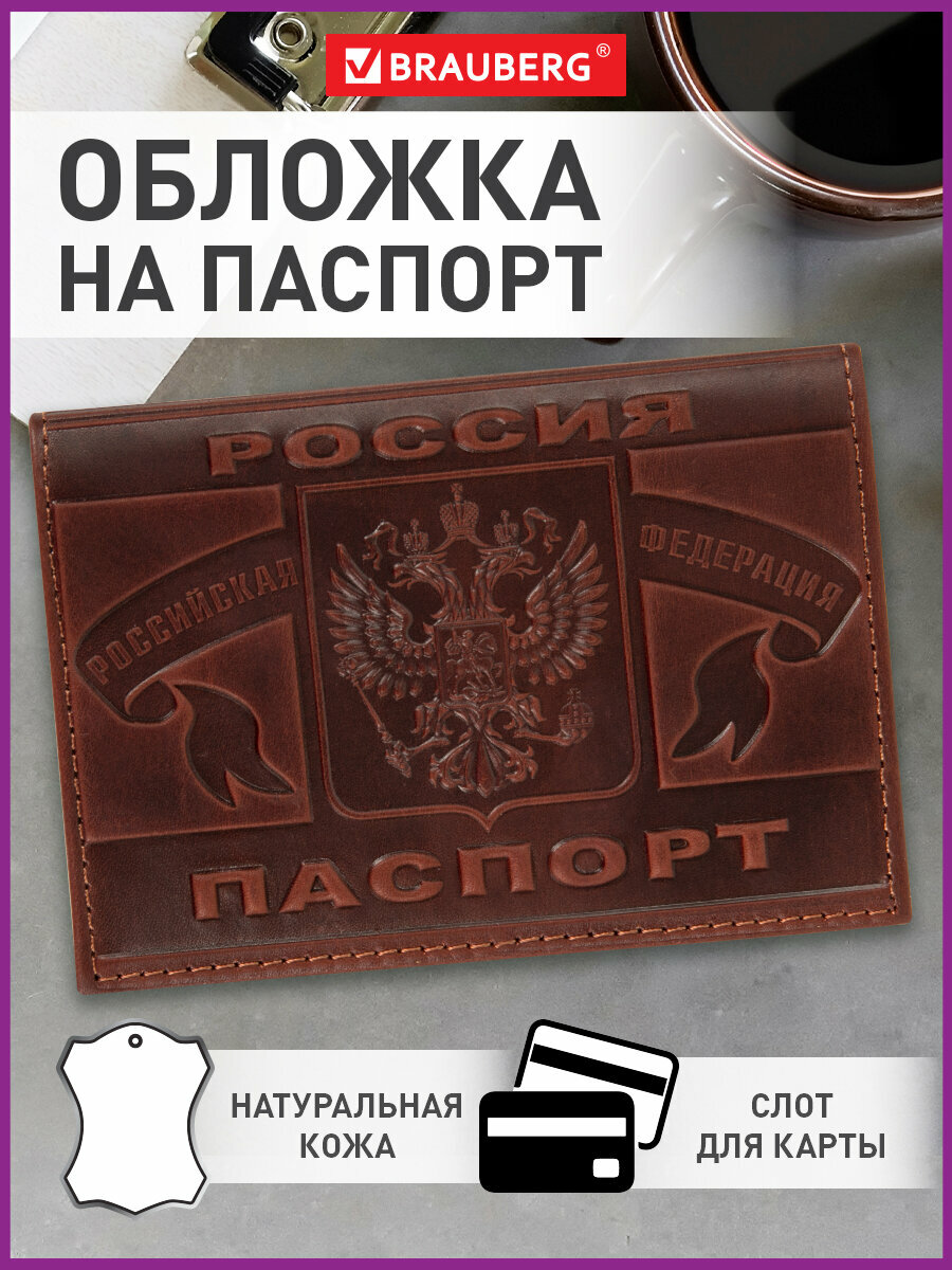 Обложка (чехол) на паспорт / для документов натуральная кожа герб Рф + Паспорт Россия Brauberg интересное:
