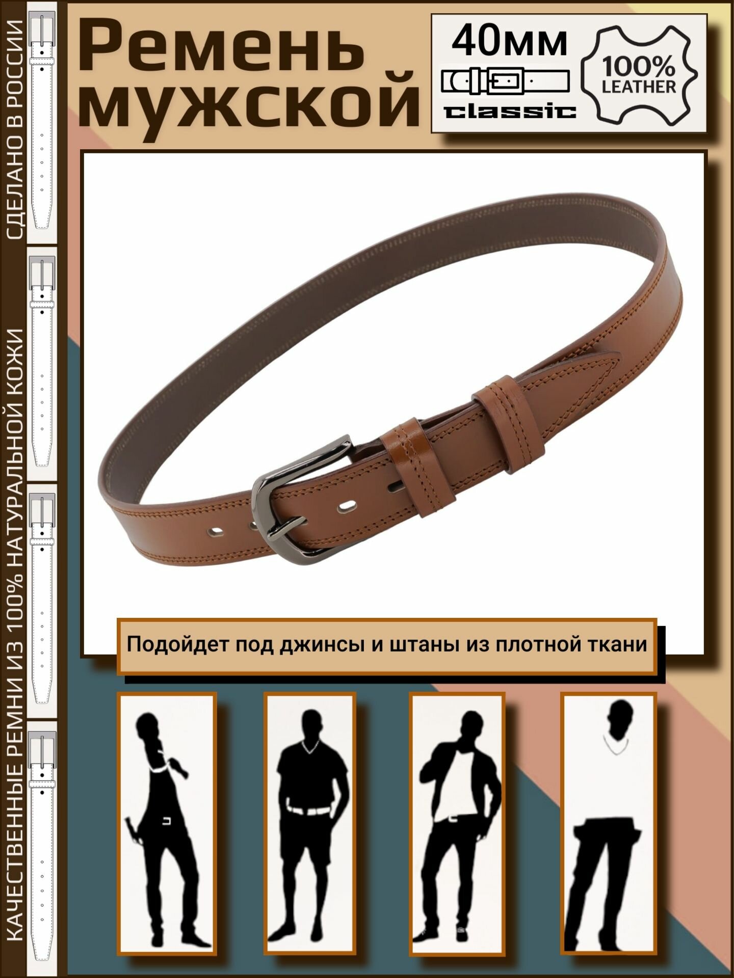 Ремень мужской кожаный Aksy Belt коричневый, 40мм, 2 строчка, Италия, темное серебро, 110 см