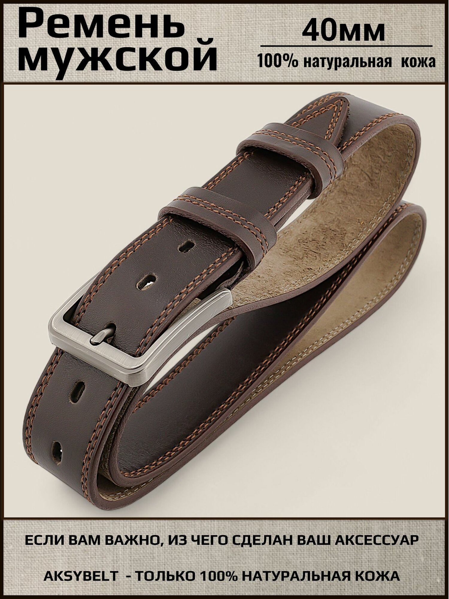 Ремень мужской кожаный Aksy Belt коричневый, 40мм, 2 строчка, Италия, матовое серебро, 130 см