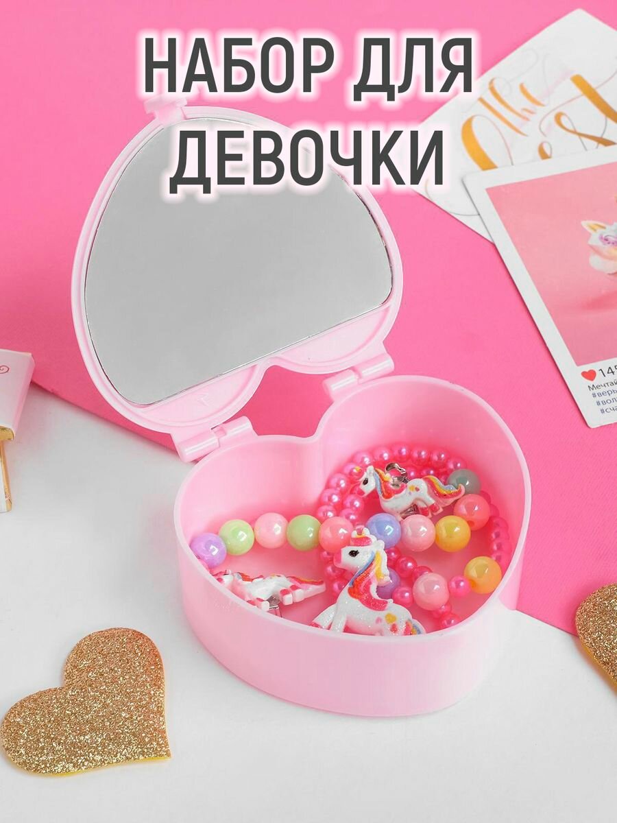 Купить Комплект детский 3 предмета: клипсы, бусы, браслет"Шкатулка" с зеркалом, цветной 5060471 .