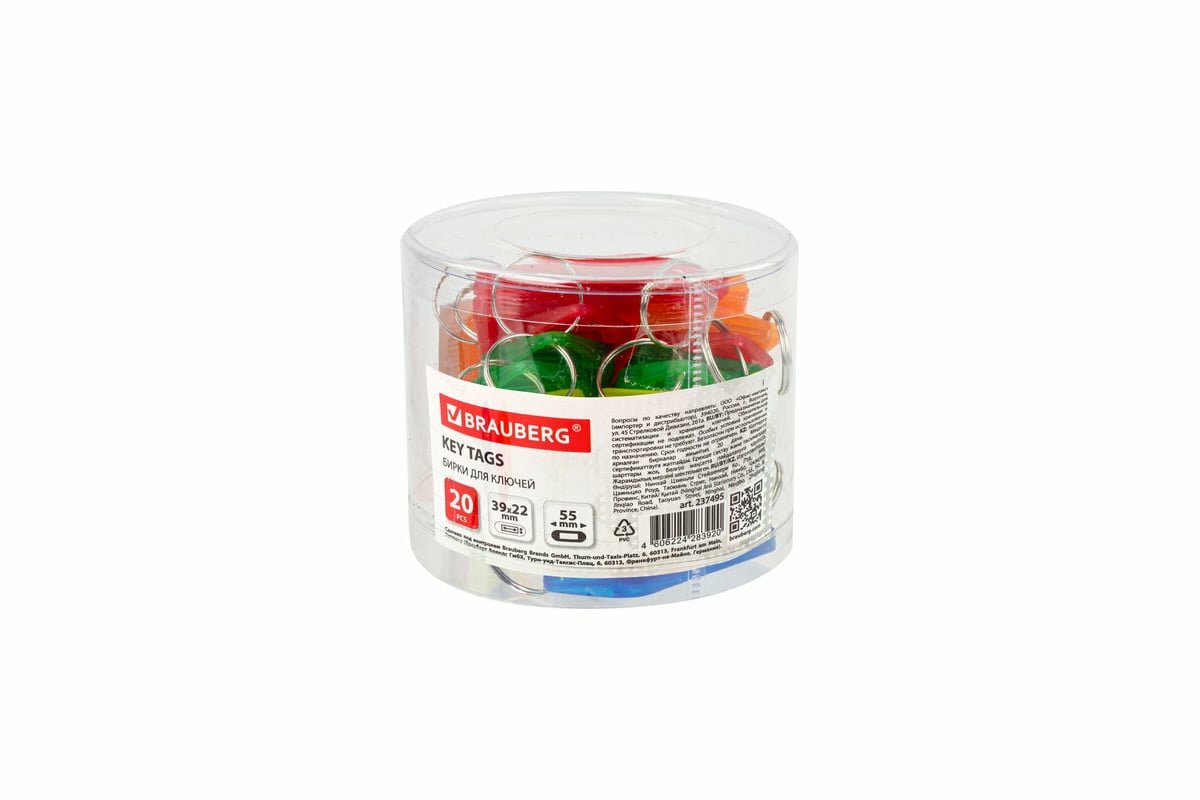 BRAUBERG Бирки для ключей комплект 20 ШТ., длина 55 мм, инфо-окно 39х22 мм, ассорти, 237495