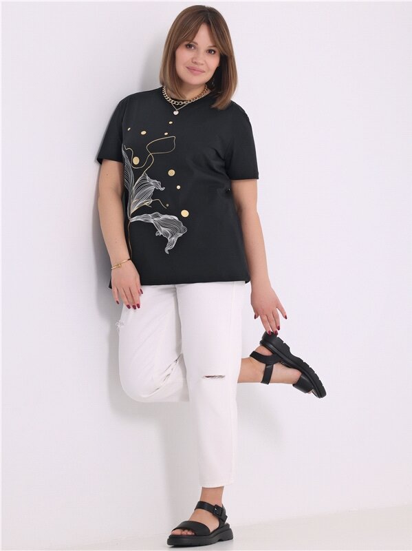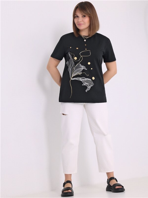 Футболка женская черная с принтом хлопок 100% Апрель 1ЖДФК3298001/1190/599/*/3436/*/*/* черный 108-164