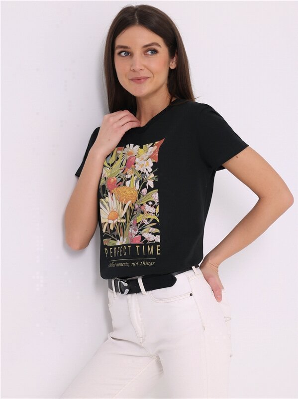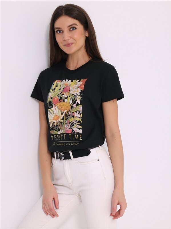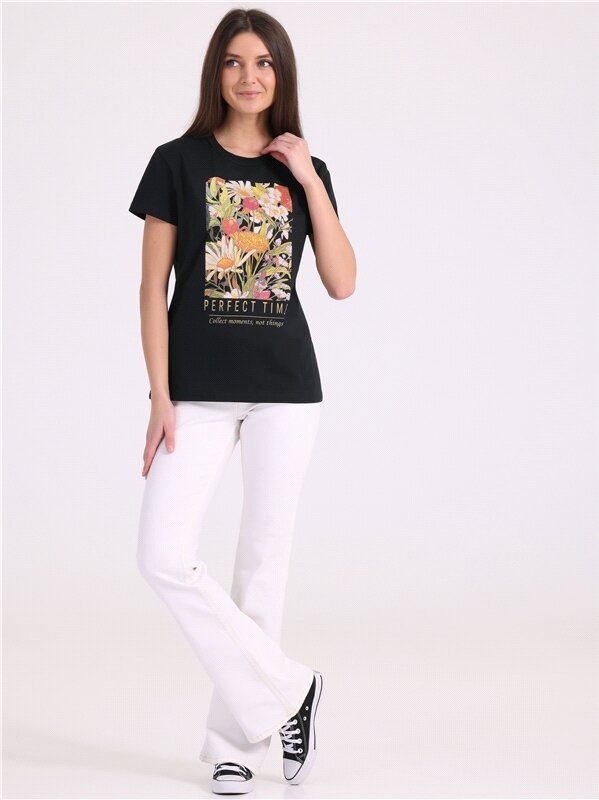 Футболка женская черная с принтом хлопок 100% Апрель 1ЖДФК3298001/1190/599/*/3436/*/*/* черный,мультиколор 108-164