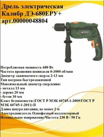 Дрель ударная калибр ДЭ- 680ЕРУ+ 680 Вт, 3000 об/мин, темно-зеленый