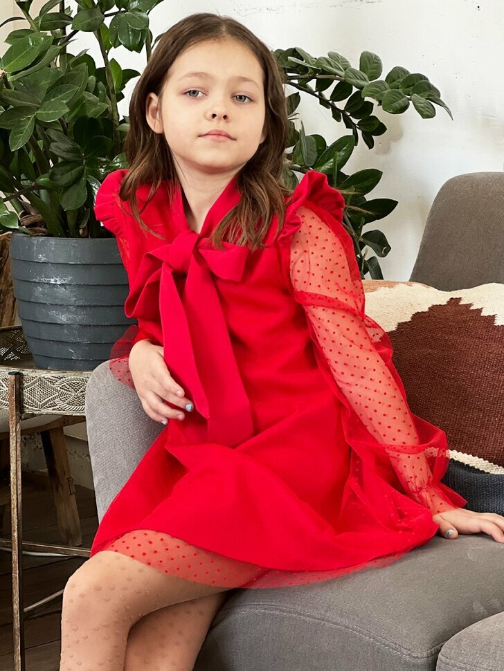 Платье для девочки нарядное бушон ST50, отделка фатин, цвет красный (122-128)