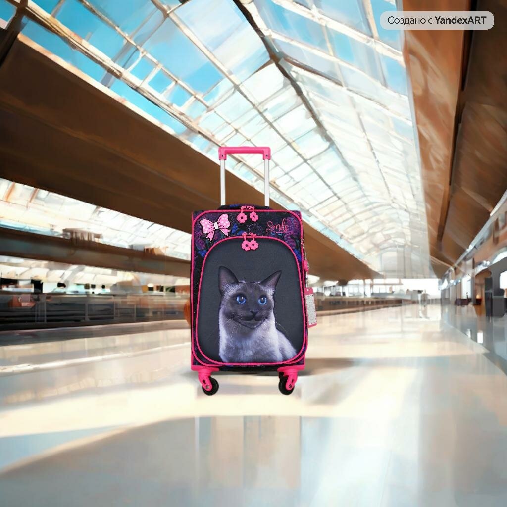 Чемодан дет. Котик 20", 35х20х40, отд. на молнии, 4 колеса, розовый
