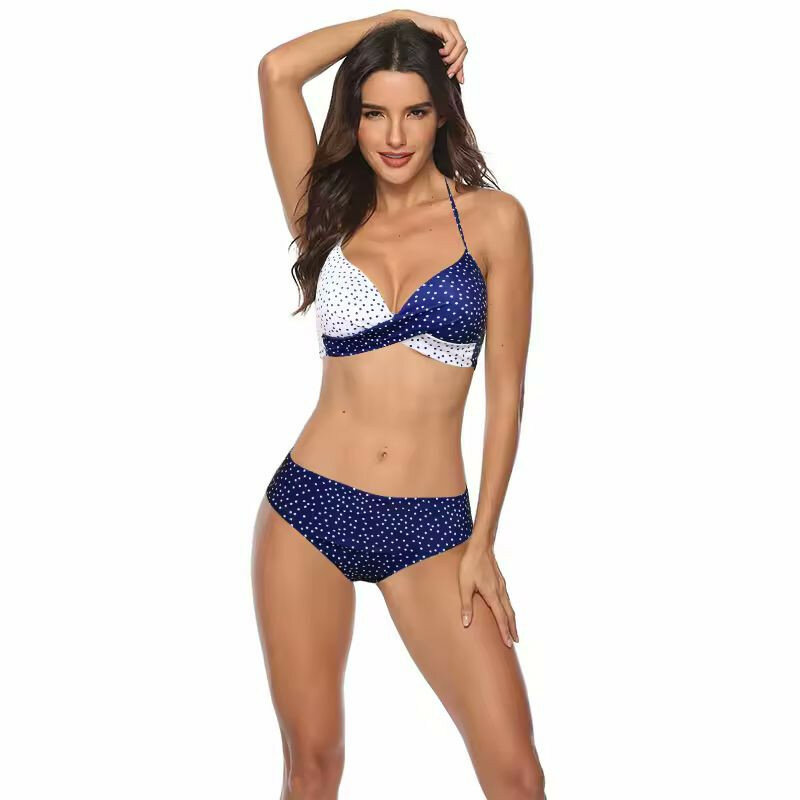 Женский сине-белый раздельный купальник в горошек, синий с белым, S