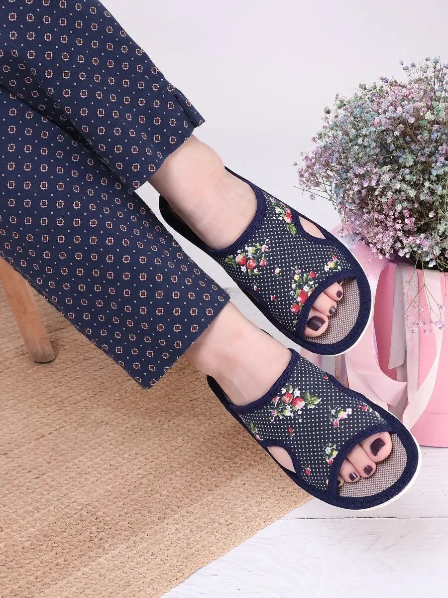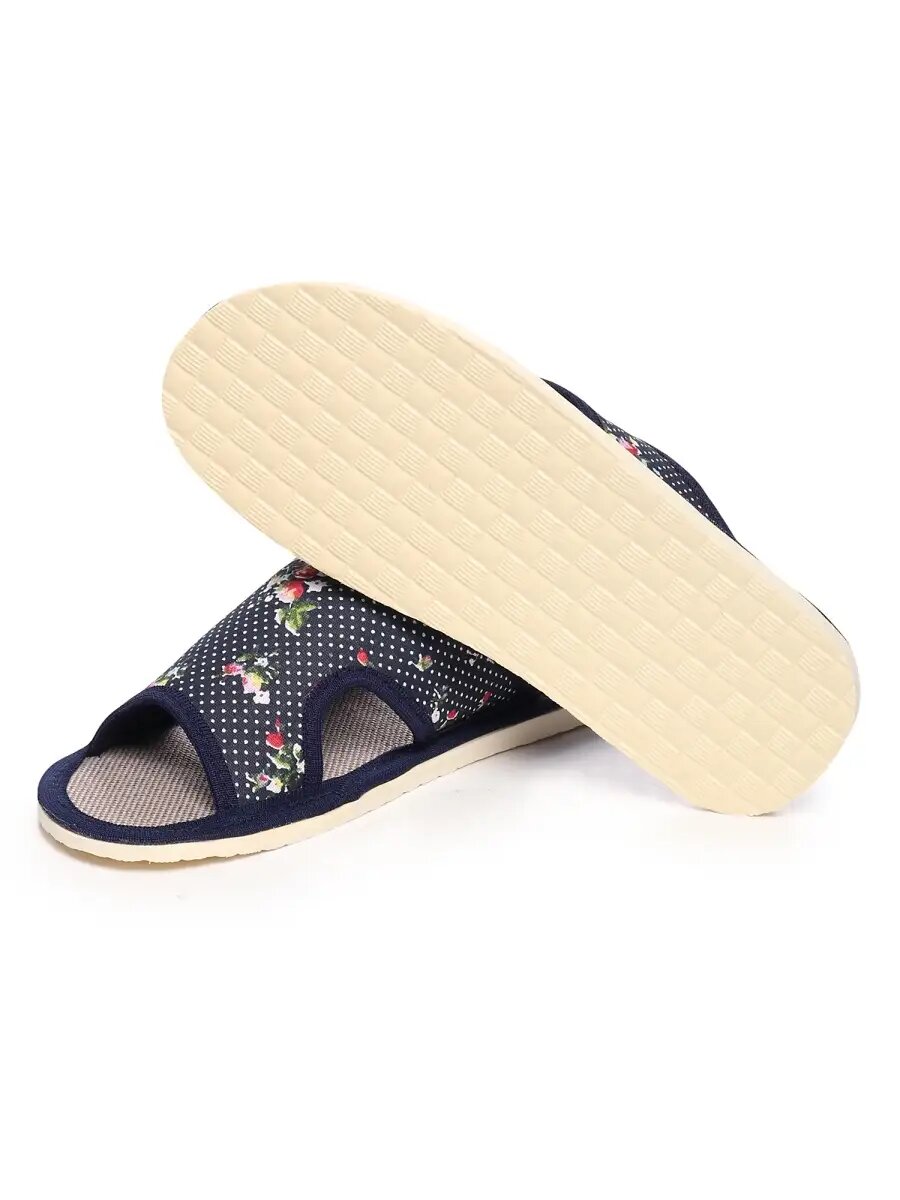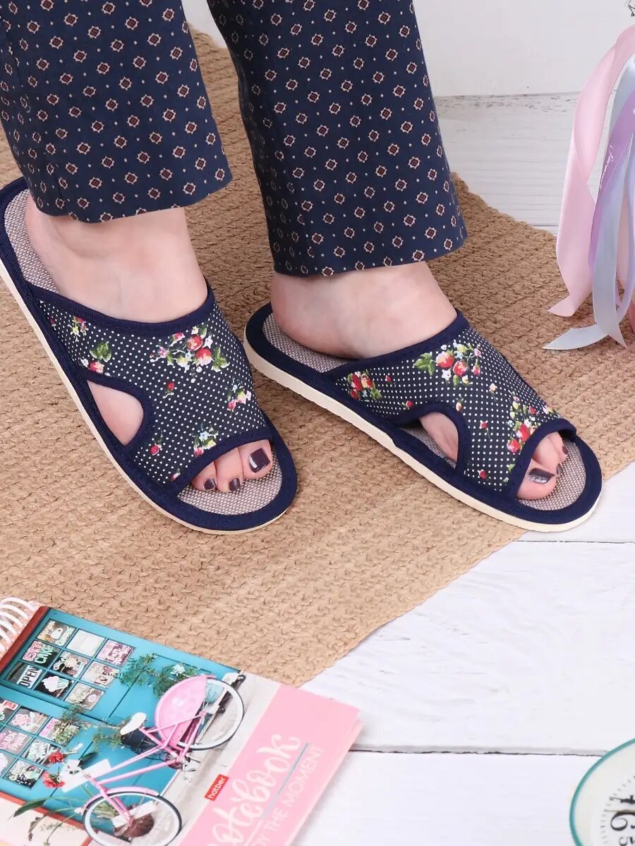 Купить Женские домашние тапочки "LepiloV", открытые, на текстильной стельке. Размер 39. Синий горох, цветы.