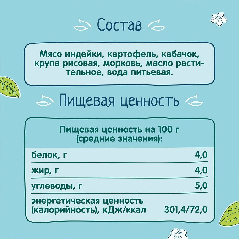 | Состав | мясо индейки / картофель / кабачок / крупа рисовая / морковь / масло растительное / вода питьевая |