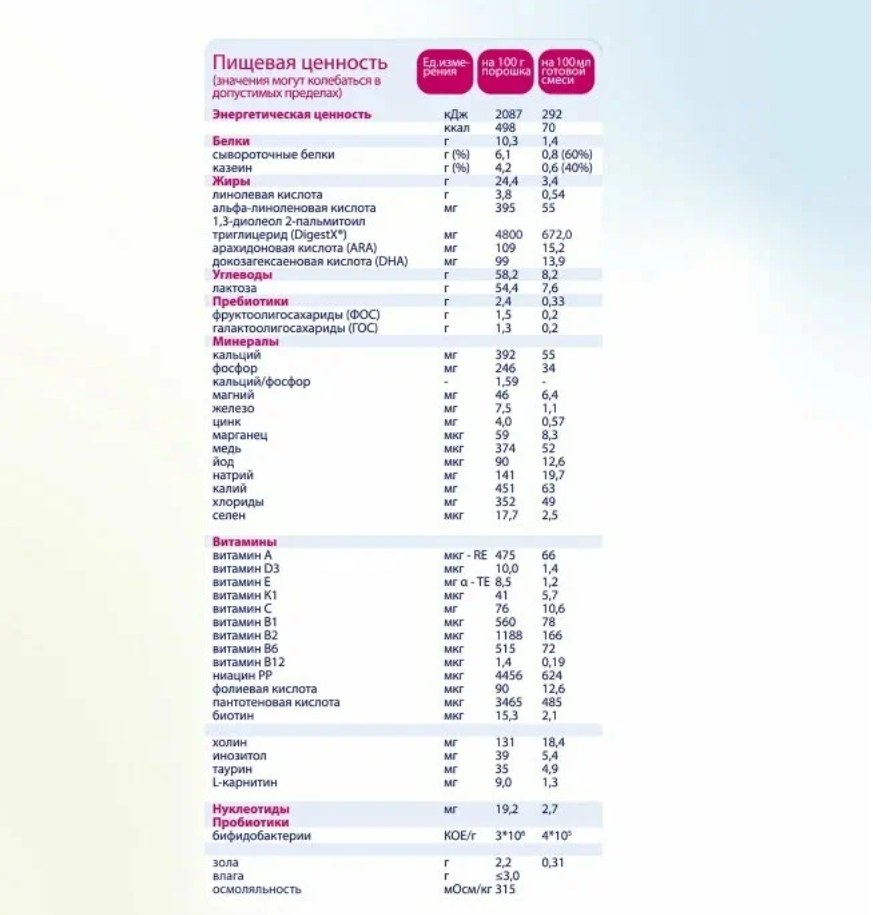 | Состав | обезжиренное козье молоко / лактоза / растительные масла (кокосовое масло / низкоэруковое рапсовое масло / подсолнечное масло) / DigestX (1,3-диолеол 2-пальмитоил триглицерид) / концентрат сывороточных белков козьего молока / галактоолигосахариды / фруктоолигосахариды / минеральный премикс (карбонат кальция / натрия цитрат / кальциевая соль ортофосфорной кислоты / калия гидроксид / кальция цитрат / магния хлорид / железа сульфат / цинка сульфат / меди сульфат / марганца сульфат / йодид калия / селенат натрия) / рыбий жир (источник DHA) / холина битартрат / арахидоновая кислота / L-фенилаланин / витаминный премикс (L-аскорбиновая кислота / L-аскорбат натрия / ниацинамид (синоним - никотинамид) / D-пантотенат кальция / рибофлавин / тиамина гидрохлорид / ретинол ацетат / пиридоксина гидрохлорид / DL-альфа-токоферола ацетат / фолиевая кислота / фитоменадион / D-биотин / D3 холекальциферол / цианокобаламин) / таурин / инозитол / нуклеотиды (цитидин-5-монофосфат / инозин-5-монофосфат динатриум / уридин-5-монофосфат динатриум / аденозин-5-монофосфат / гуанозин 5-монофосфат динатриум) / L-карнитин / бифидобактерии (Bifidobacterium BB-12*). Не содержит кристаллический сахар. *BB-12 - зарегистрированная торговая марка компании Chr.Hansen. |