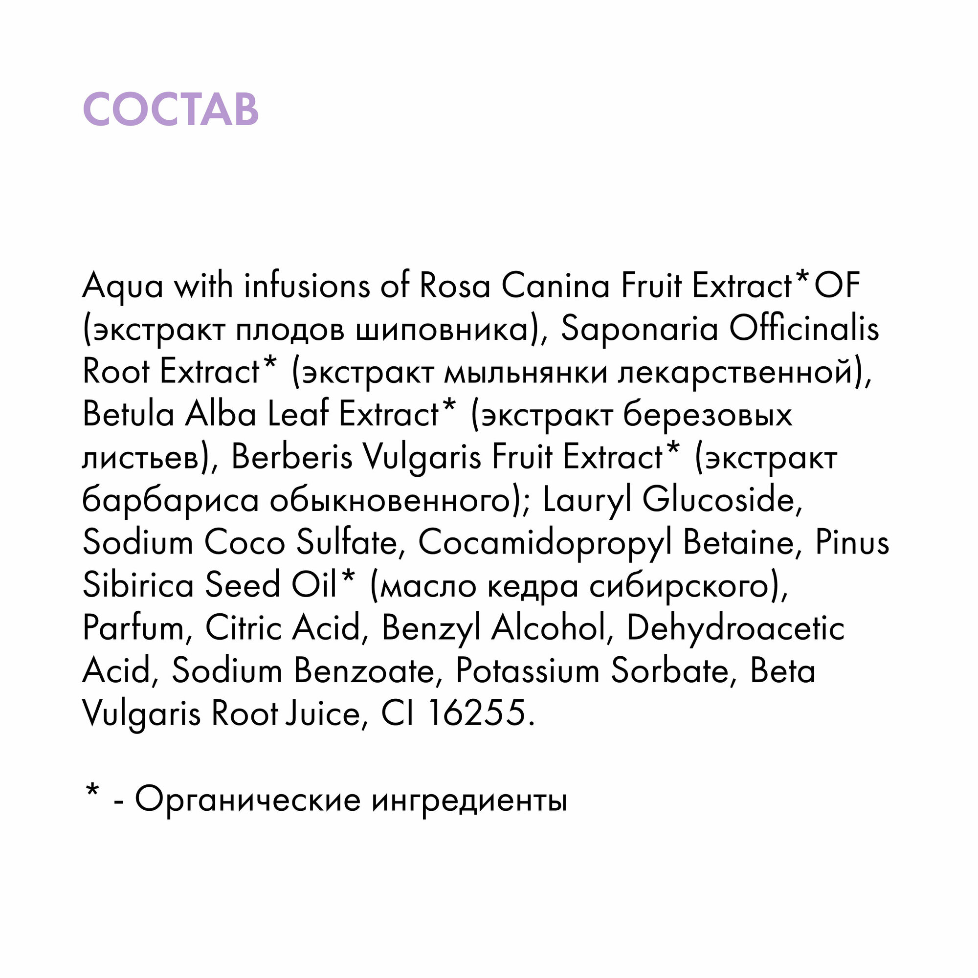 | Состав | Aqua with infusions of Rosa Canina Fruit Extract*OF (экстракт плодов шиповника) / Saponaria Officinalis Root Extract* (экстракт мыльнянки лекарственной) / Betula Alba Leaf Extract* (экстракт березовых листьев) / Berberis Vulgaris Fruit Extract* (экстракт барбариса обыкновенного); Lauryl Glucoside / Sodium Coco Sulfate / Cocamidopropyl Betaine / Pinus Sibirica Seed Oil* (масло кедра сибирского) / Parfum / Citric Acid / Benzyl Alcohol / Dehydroacetic Acid / SODIUM BENZOATE / POTASSIUM SORBATE / Beta Vulgaris Root Juice / CI 16255. |