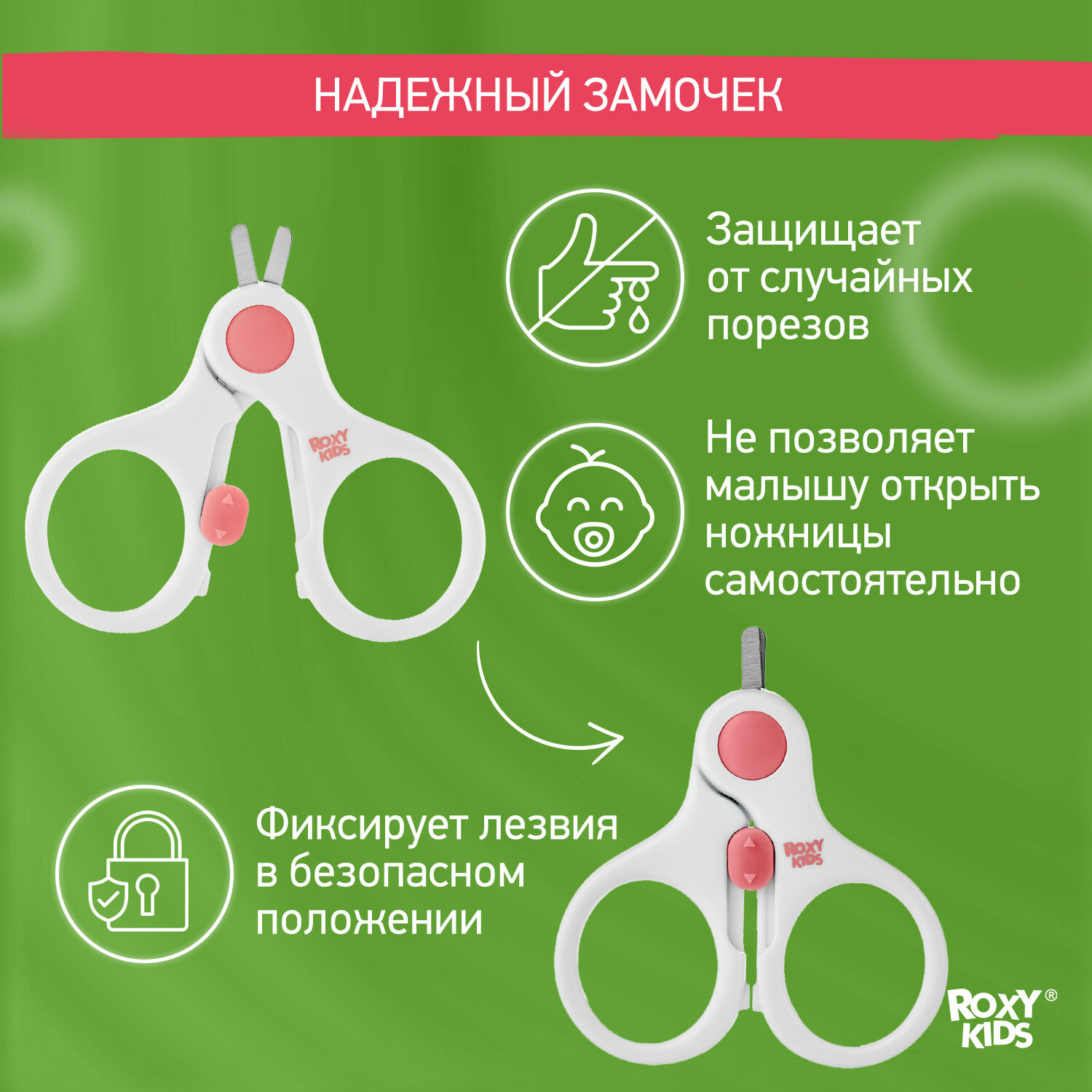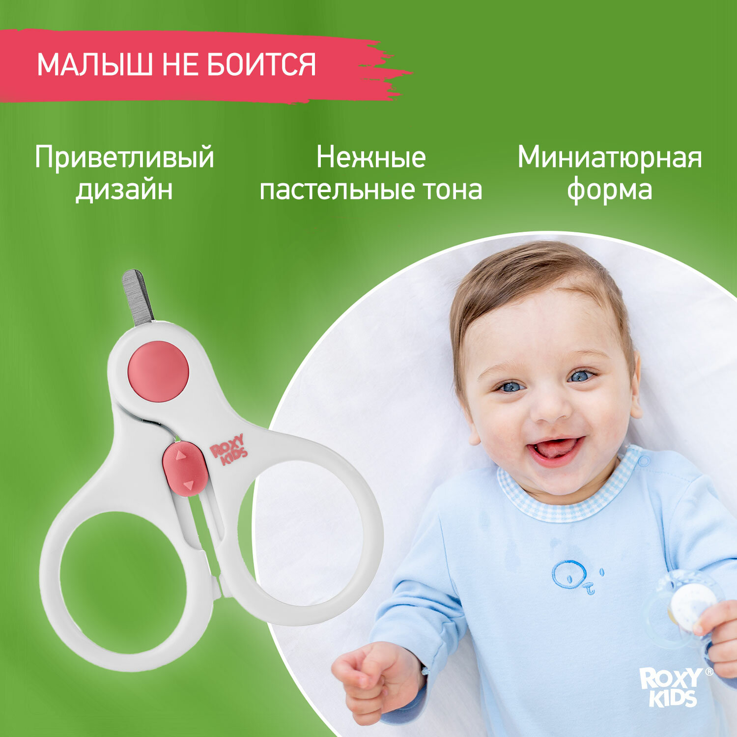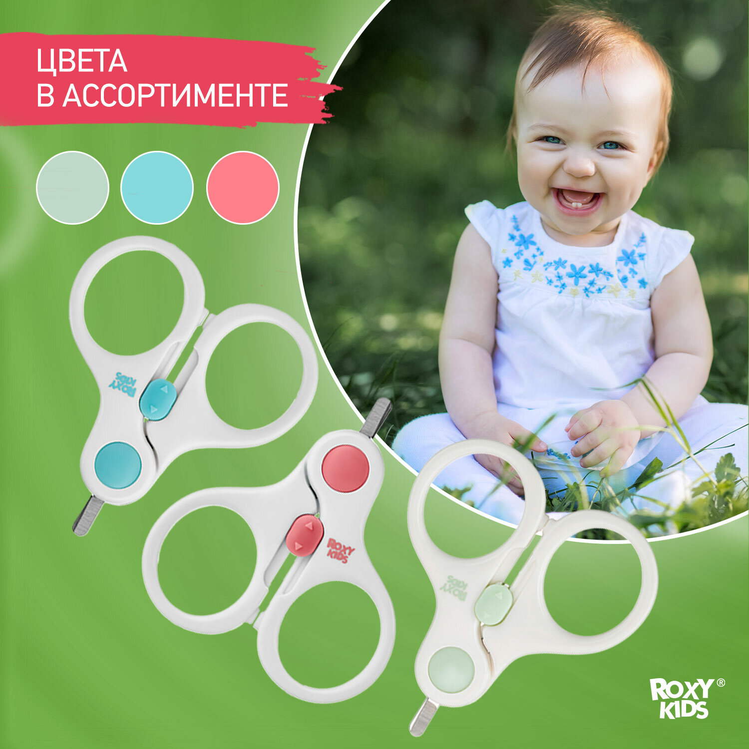 Маникюрные ножницы детские для новорожденных и малышей ROXY-KIDS с замочком и ультратонкими лезвиями, цвет зеленый