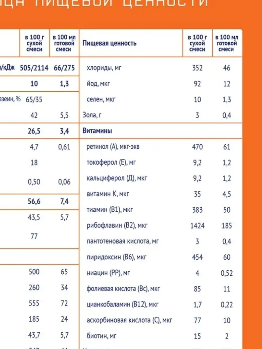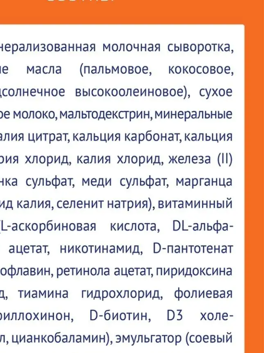 | Состав | сухая деминерализованная молочная сыворотка / растительные масла (пальмовое / кокосовое / соевое / подсолнечное высокоолеиновое) / сухое обезжиренное молоко / мальтодекстрин / минеральные вещества (цитрат калия / карбонат кальция / хлорид натрия / фосфат кальция / хлорид магния / хлорид калия / сульфат железа / сульфат цинка / сульфат меди / йодид калия / хлорид марганца / селенит натрия) / витаминный комплекс (аскорбиновая кислота / токоферола ацетат / никотинамид / D-пантотенат кальция / рибофлавин / ретинола ацетат / пиридоксина гидрохлорид / тиамина гидрохлорид / фолиевая кислота / филлохинон / D-биотин, холекальциферол / цианокобаламин) / эмульгатор (соевый лецитин) / таурин / инозит / L-карнитин / антиокислитель (L-аскорбилпальмитат) Без ГМО / консервантов / красителей и ароматизаторов. |