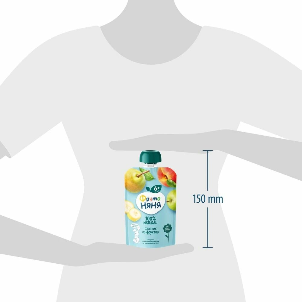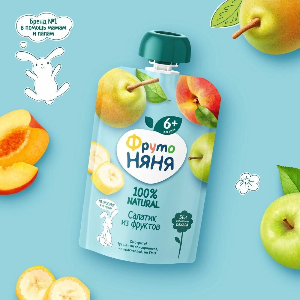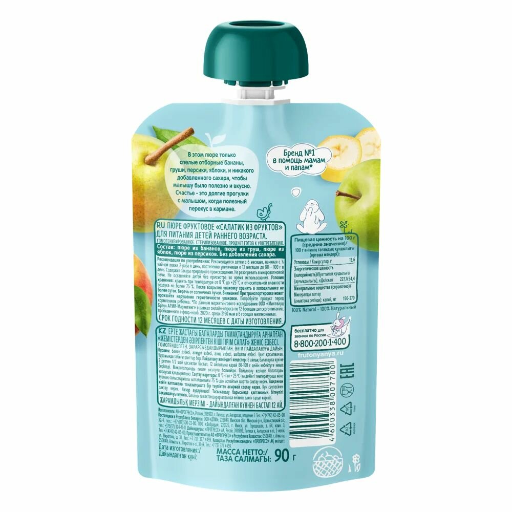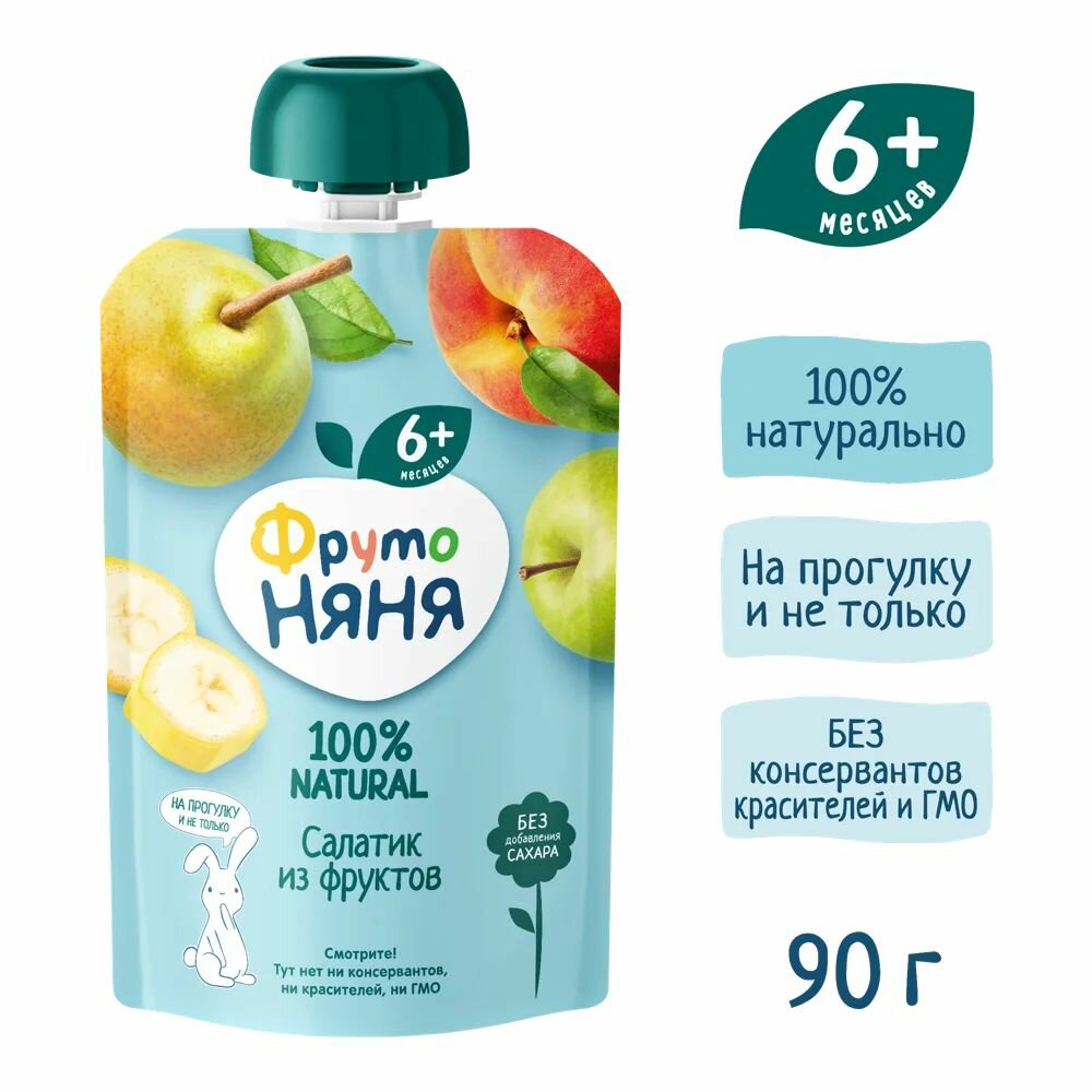 Пюре ФрутоНяня яблоко, банан, груша, персик - салатик из фруктов, с 6 месяцев, 90г, 12 шт