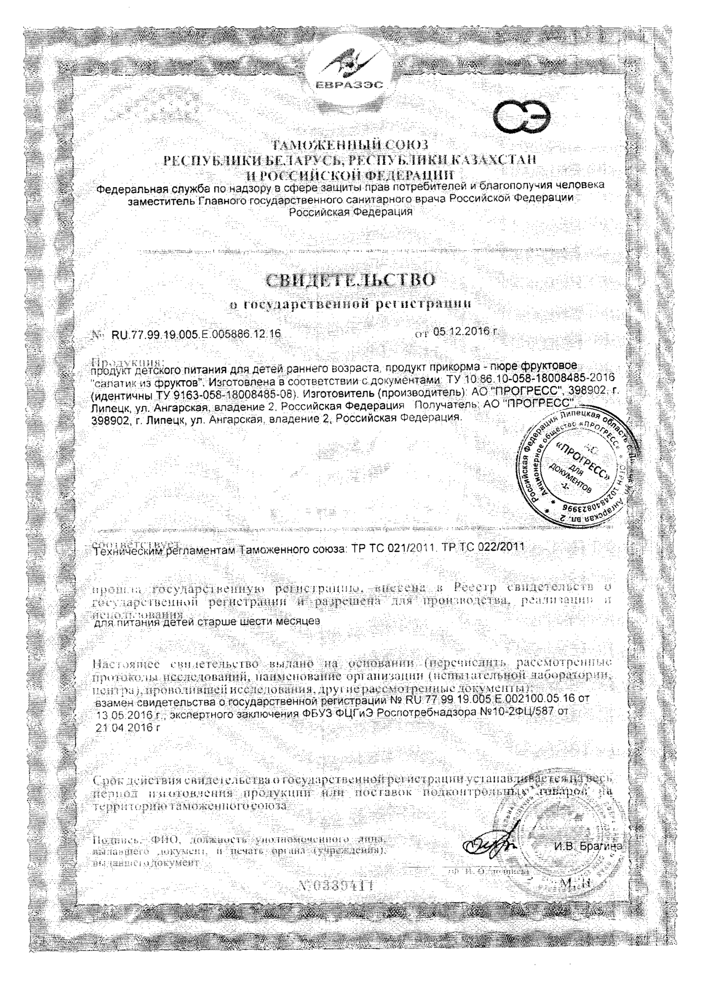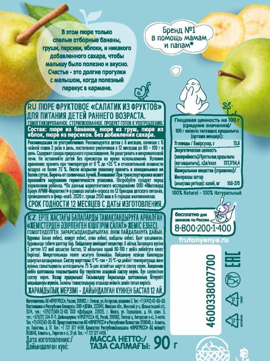 | Состав | пюре из бананов / пюре из груш / пюре из яблок / пюре из персиков. |