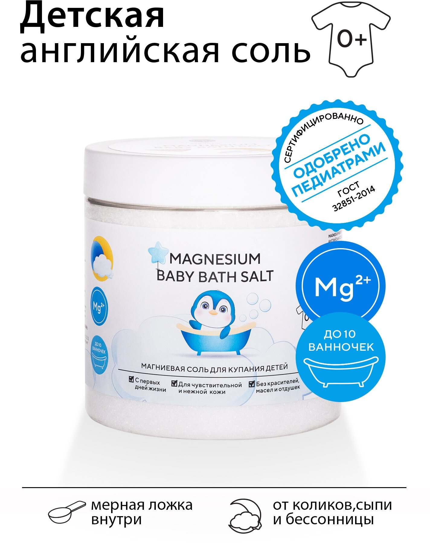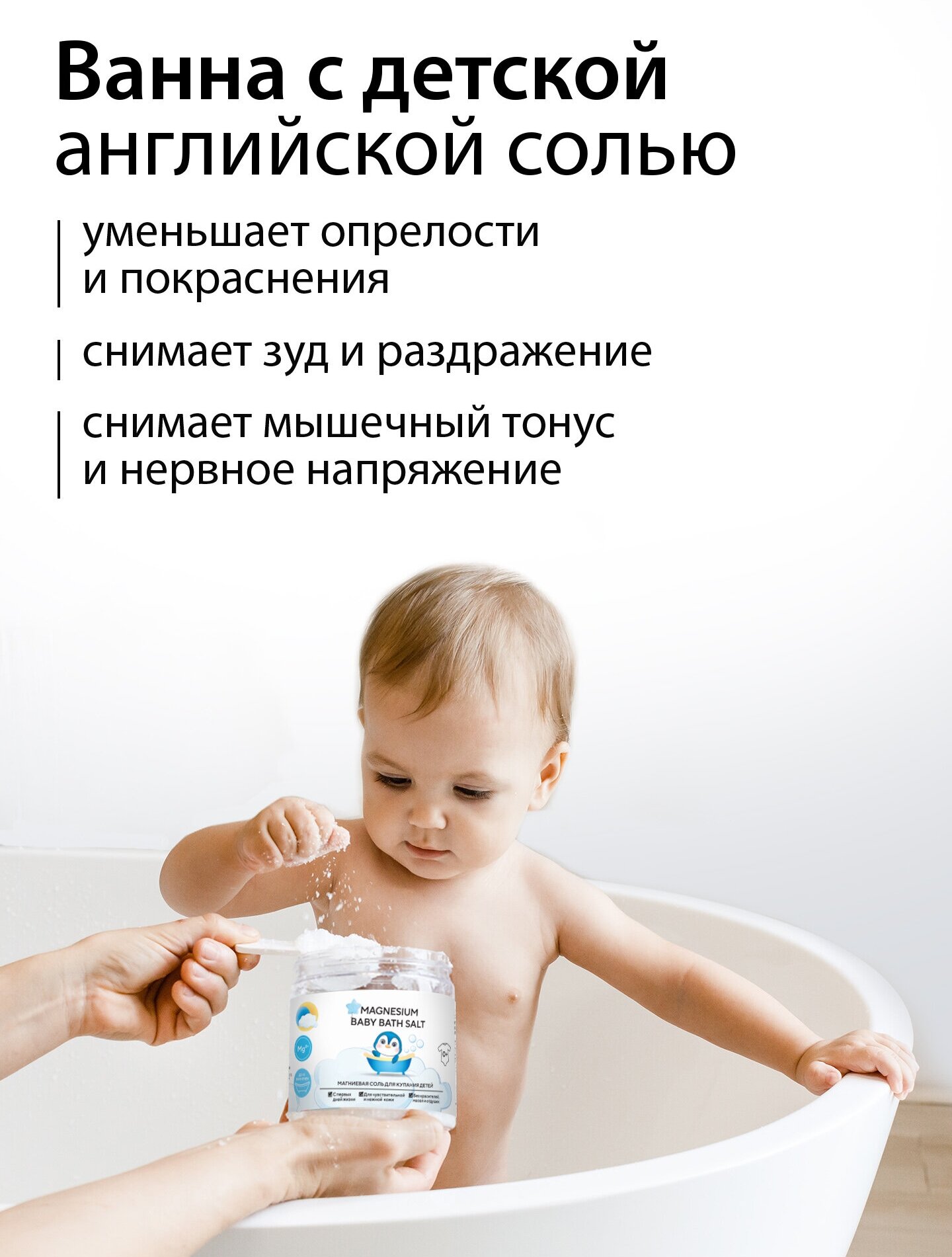 | Способ применения | используйте английскую соль для купания малышей с первых дней жизни 2-3 раза в неделю |