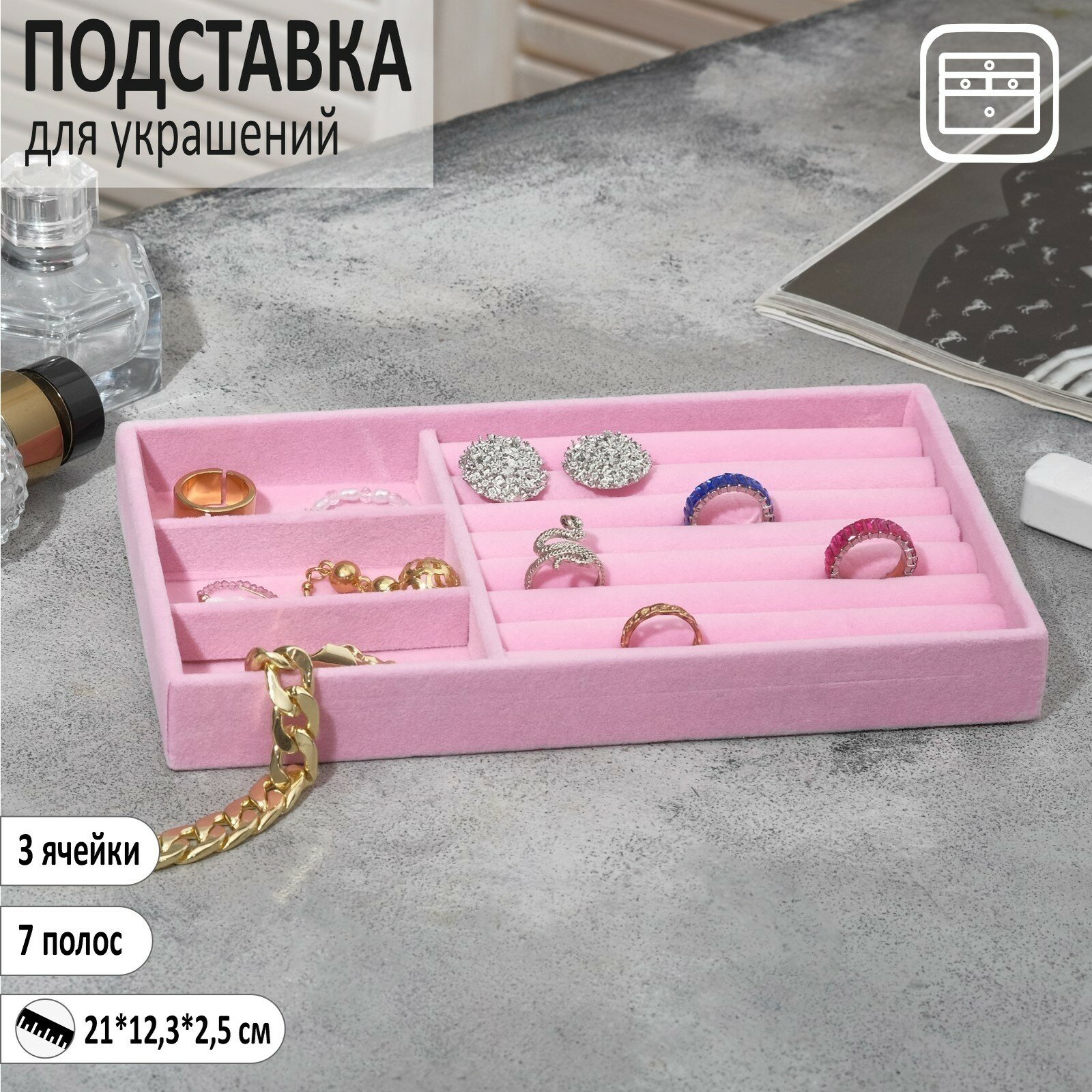 Купить Подставка для украшения 3 места и 7 полос для колец, флок, 21*12,3*2,5 см, цвет розовый 9285215