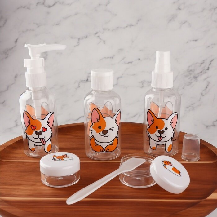 Набор в чехле 6пр: бут с расп-75мл,бут с дозат-75мл,бут-75мл,2 бан-10гр,лопатка Корги от Onlitop 758 .
