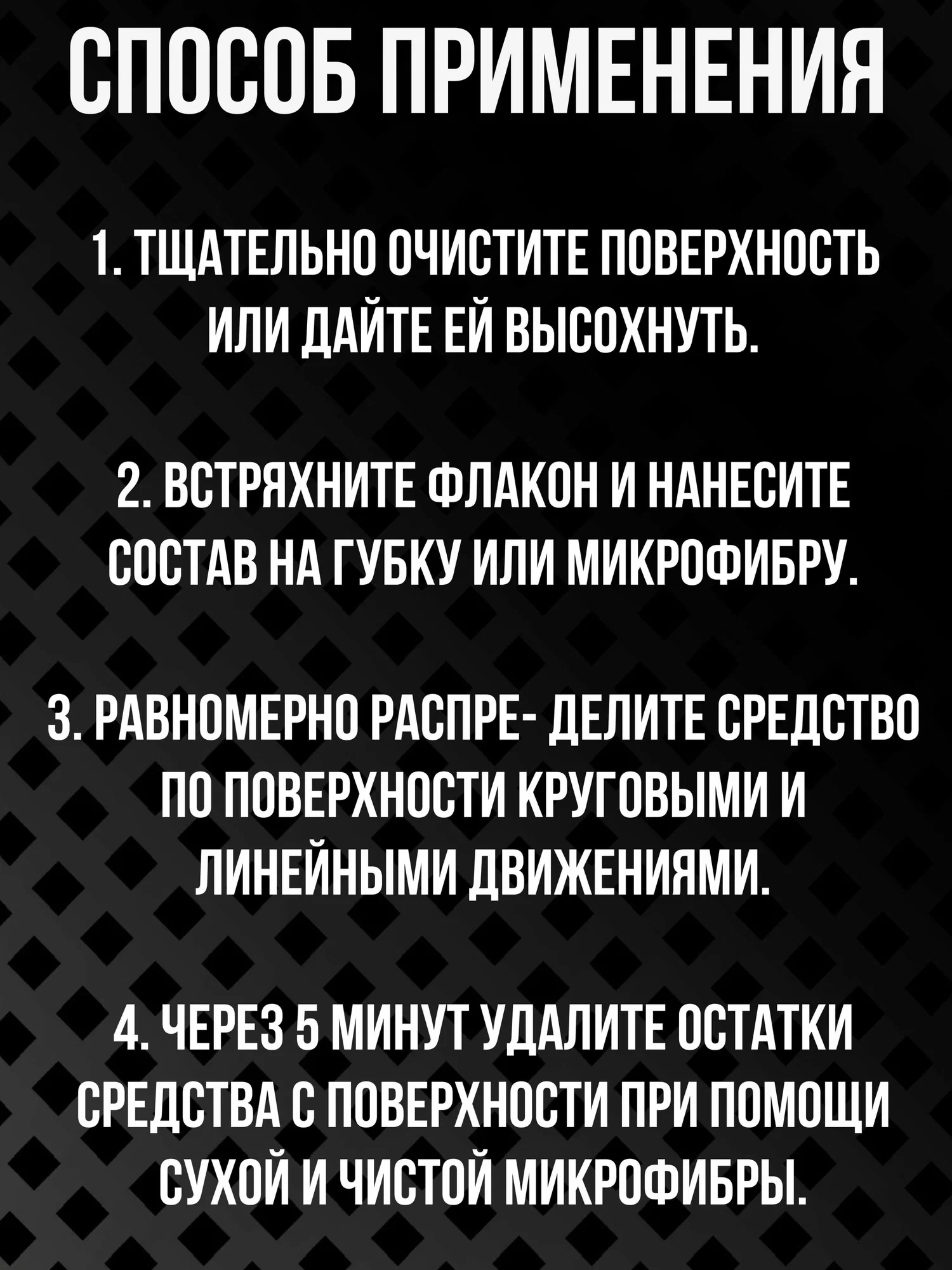 | Способ применения | 1. Тщательно очистите поверхность или дайте ей высохнуть. 2. Встряхните флакон и нанесите состав на губку или микрофибру. 3. Равномерно распре- делите средство по поверхности круговыми и линейными движениями. 4. Через 5 минут удалите остатки средства с поверхности при помощи сухой и чистой микрофибры. |