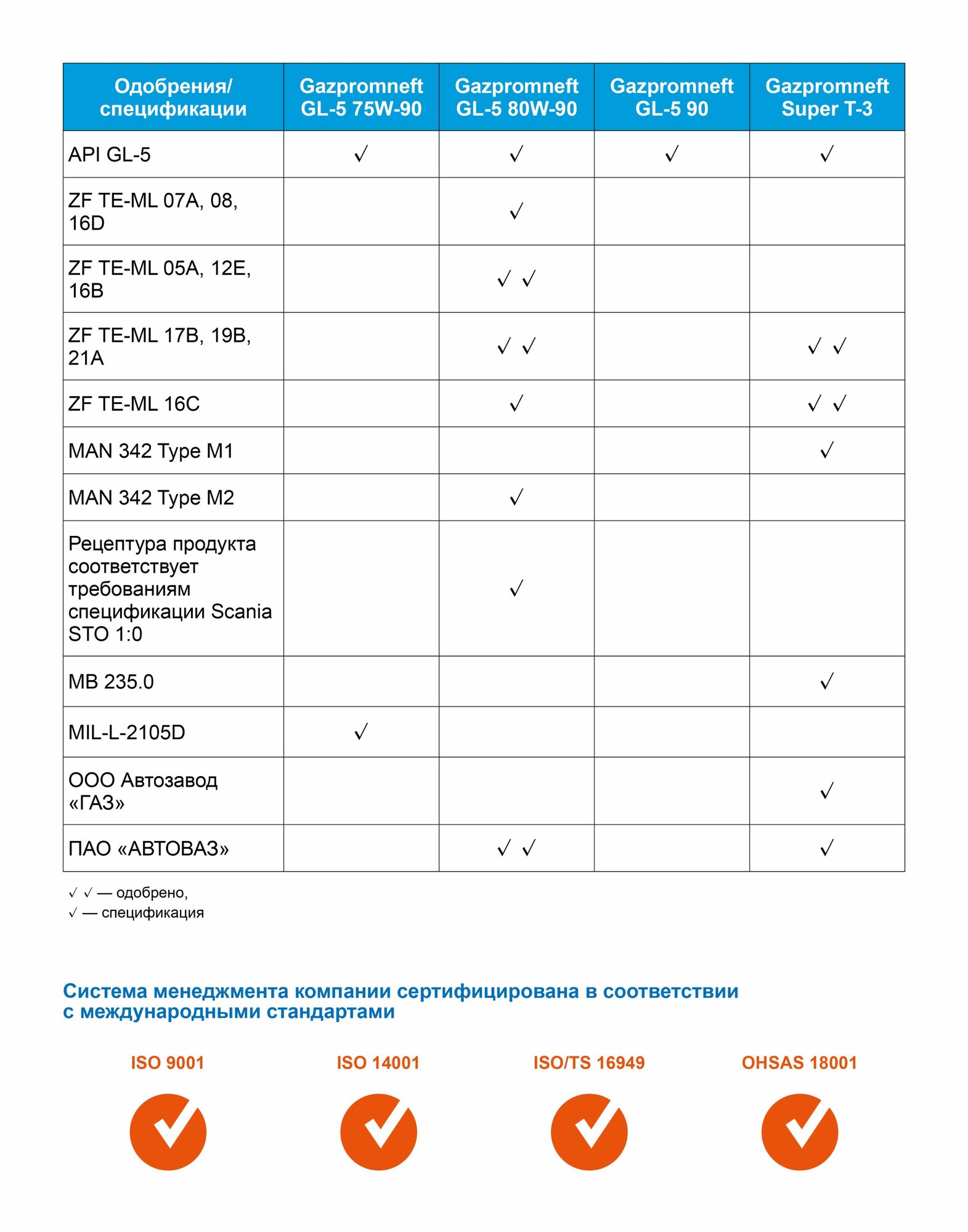 | Допуски OEM | MAN 342 Type M1 / MAN 342 Type M2 / MIL-L-2105D / Scania STO 1:0 / ZF TE-ML 05A / ZF TE-ML 07A / ZF TE-ML 08 / ZF TE-ML 16B / ZF TE-ML 16D / ZF TE-ML 17B / ZF TE-ML 19B / ZF TE-ML 21A / ПАО «АвтоВАЗ» |